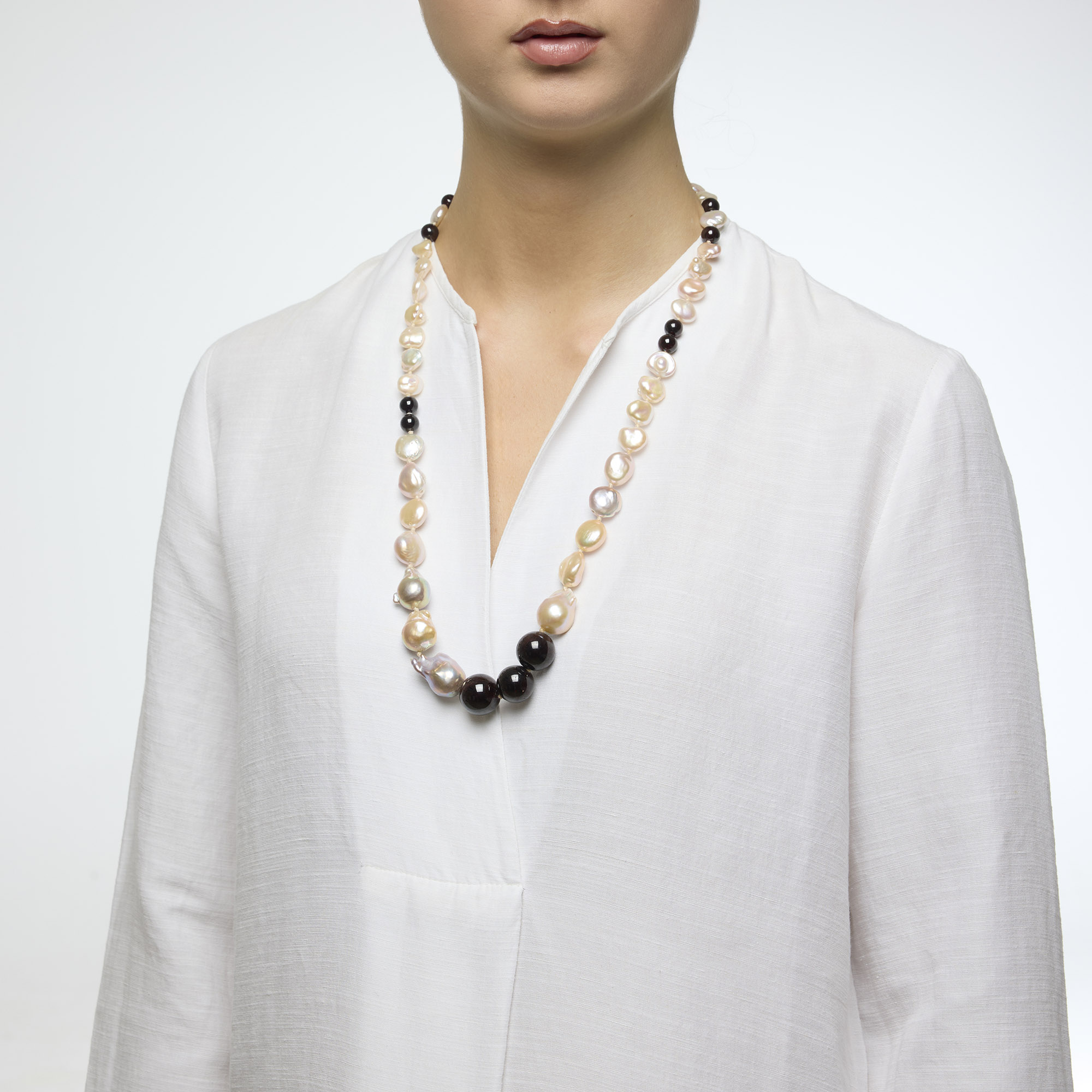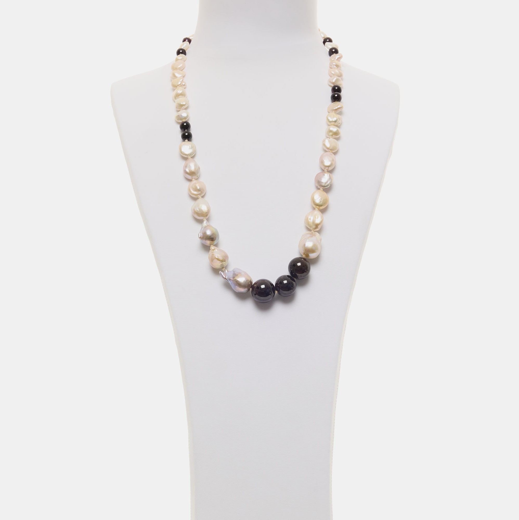 Collana infilata in Perle d’acqua dolce a forme assortite e barocche, grigie e rosate, con Granato a sfera liscia. Chiusura in Argento 925‰ rodiato. Realizzata in Italia.