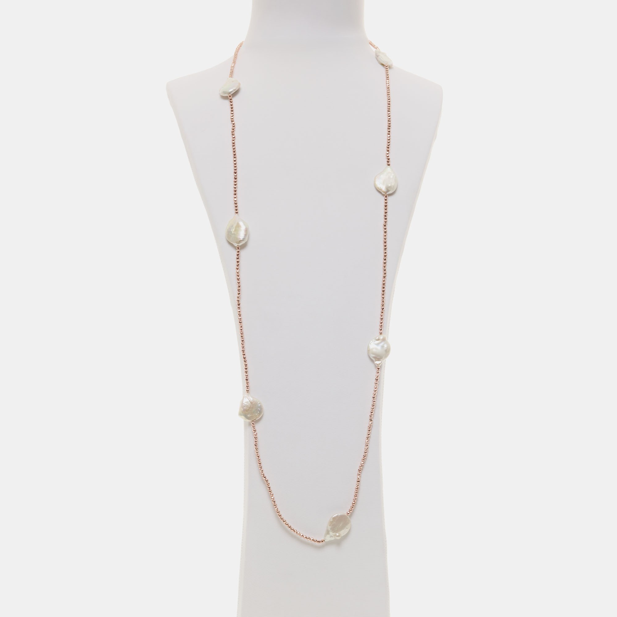 Collana lunga infilata, con Perle d’acqua dolce bianche piatte ed Ematite rosata. Realizzata in Italia.