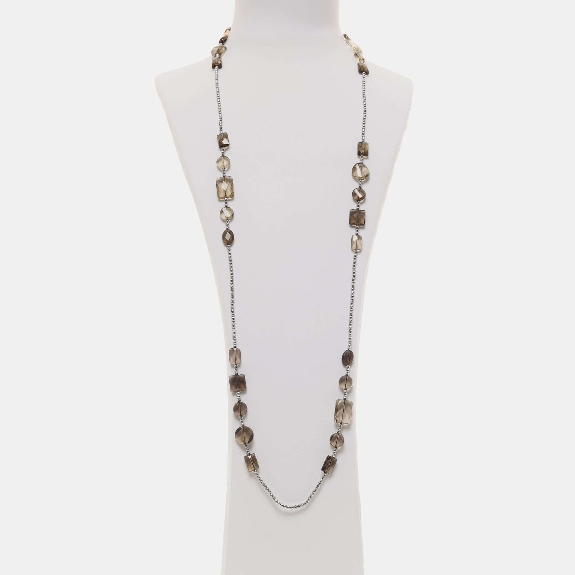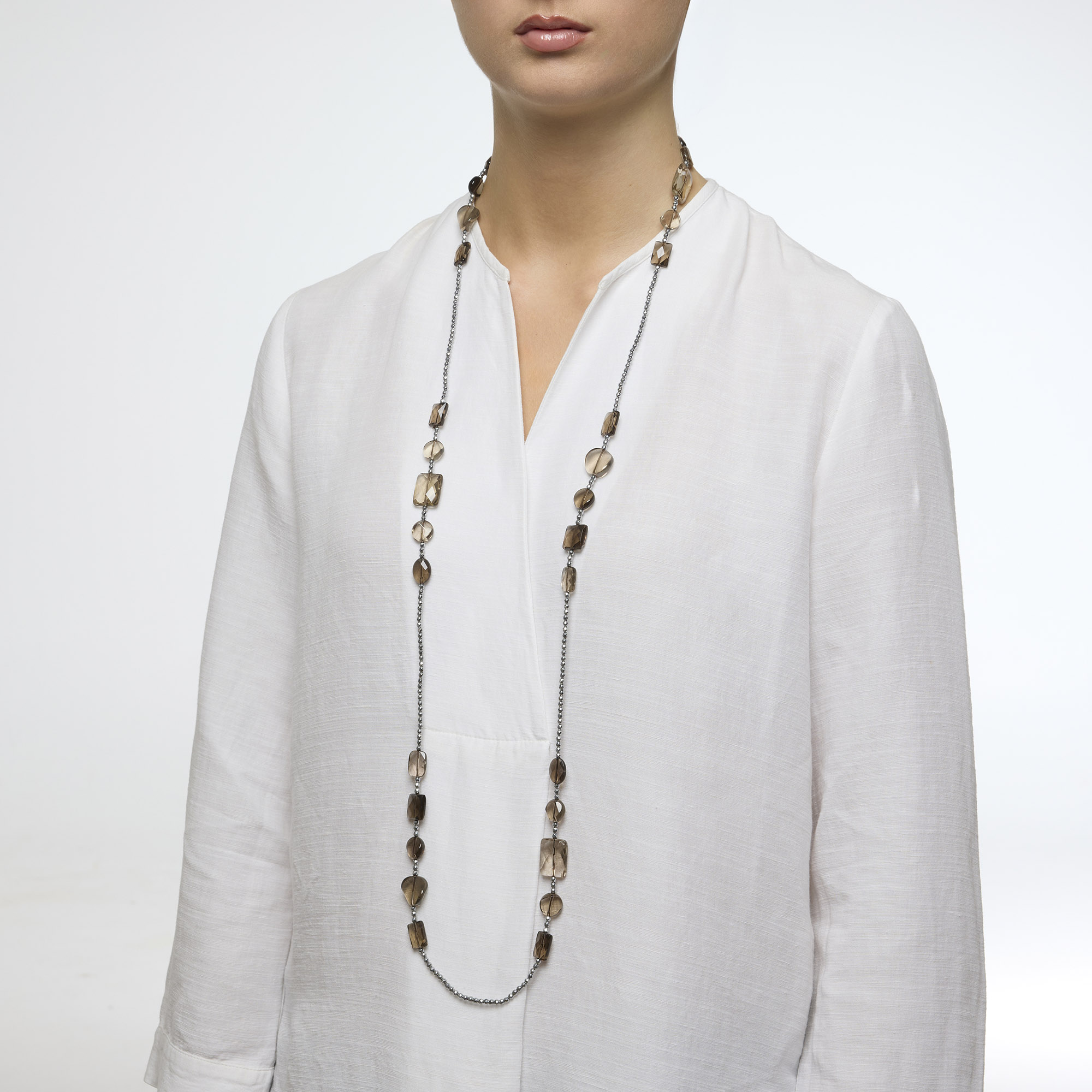 Collana lunga infilata in Quarzo Fumé con Ematite rodiata. Realizzata in Italia.