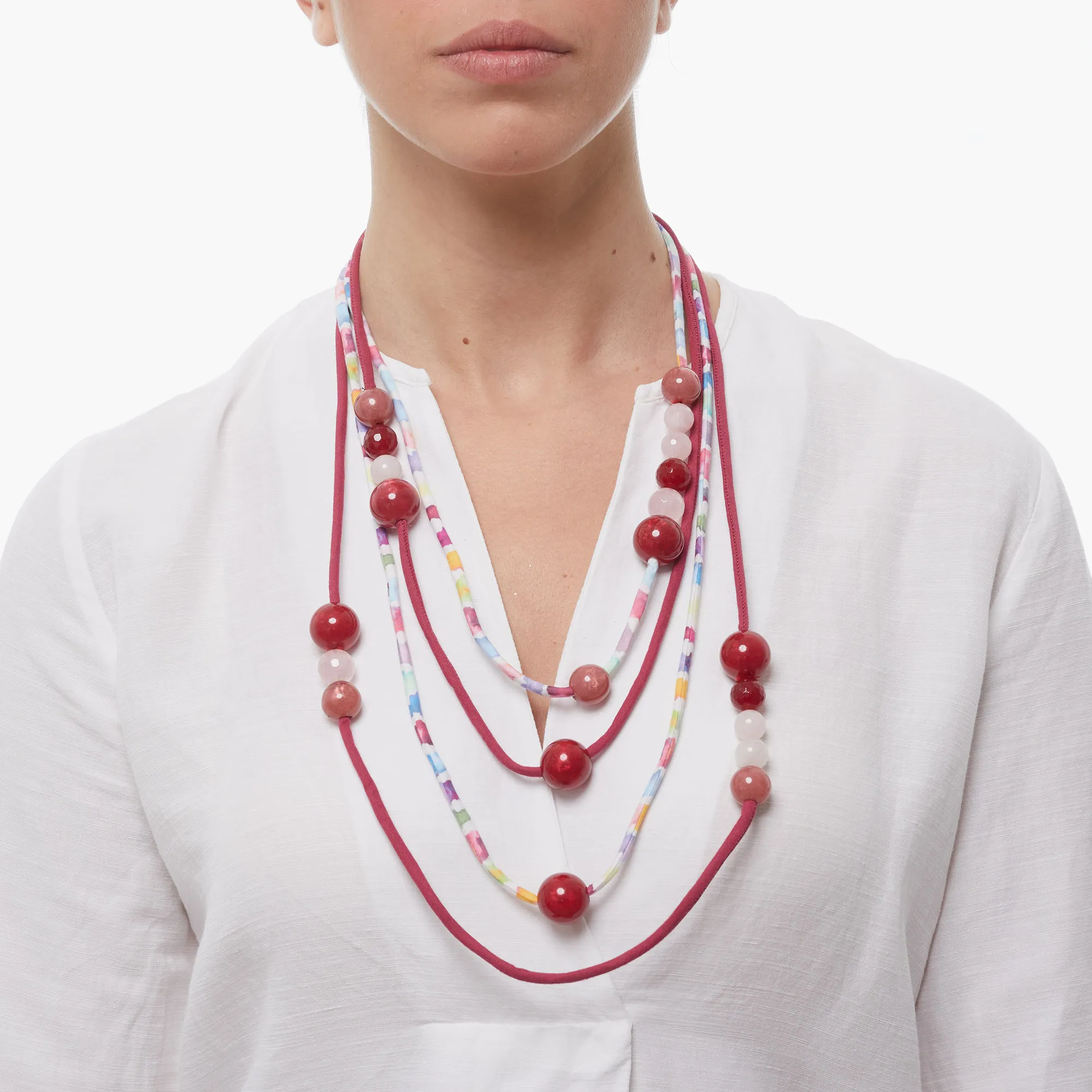 Collana infilata a quattro fili in tessuto, con elementi a sfera in resina e sfere di Quarzo Rosa e Quarzo Ciliegia. Lunghezza 75cm. Realizzata in Italia.