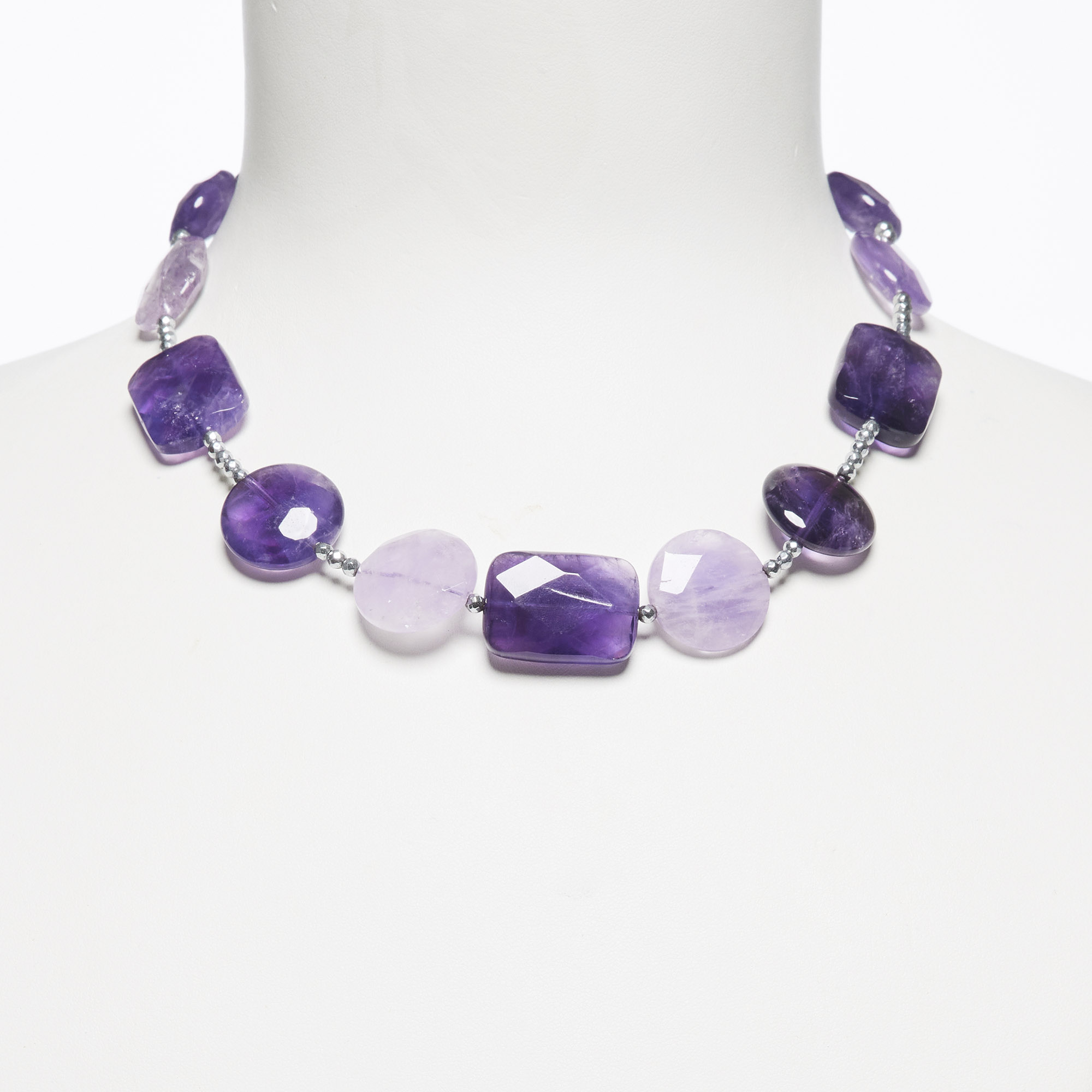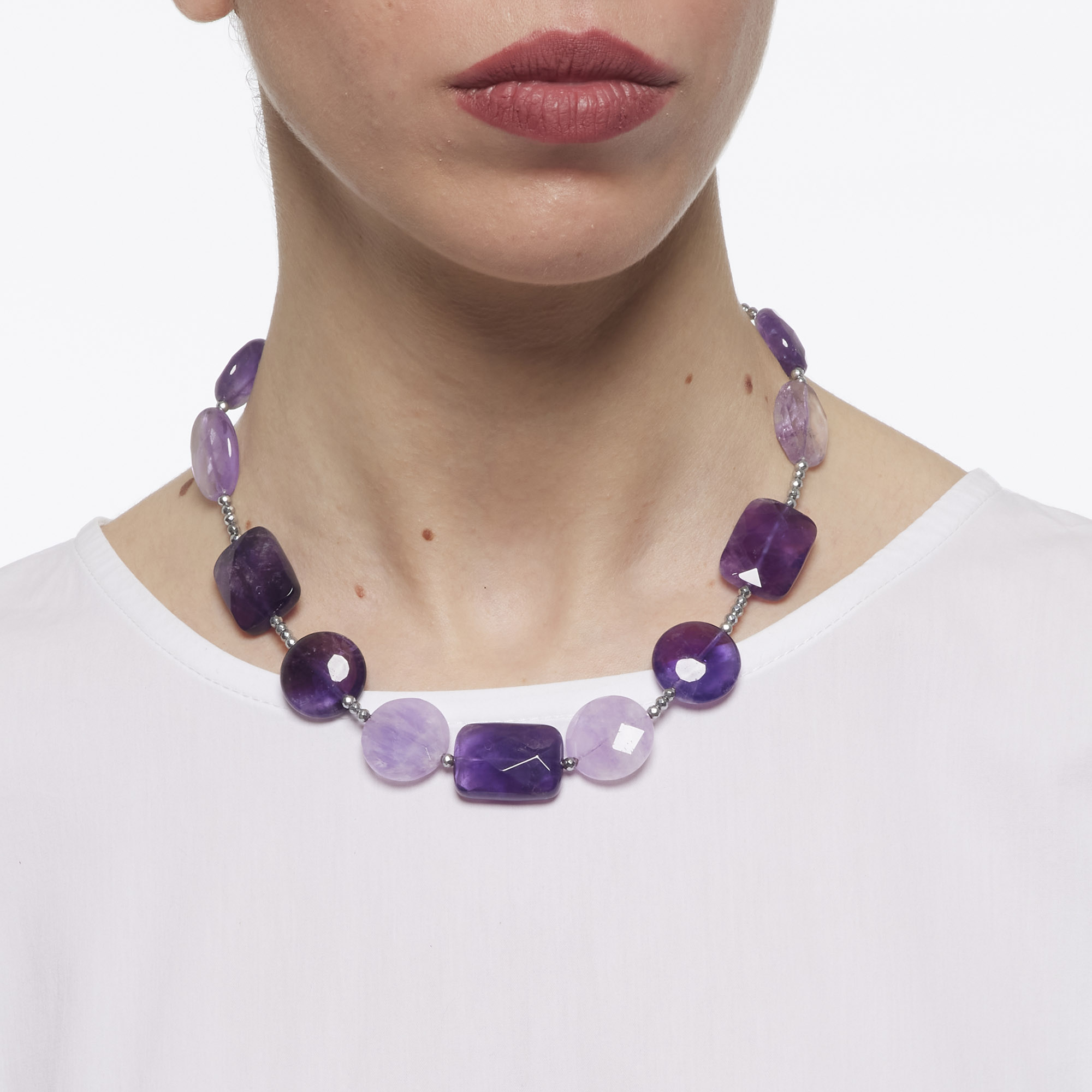 Collana infilata corta in Ametista ed Ematite rodiata, con chiusura in Argento 925‰ rodiato. Realizzata in Italia.