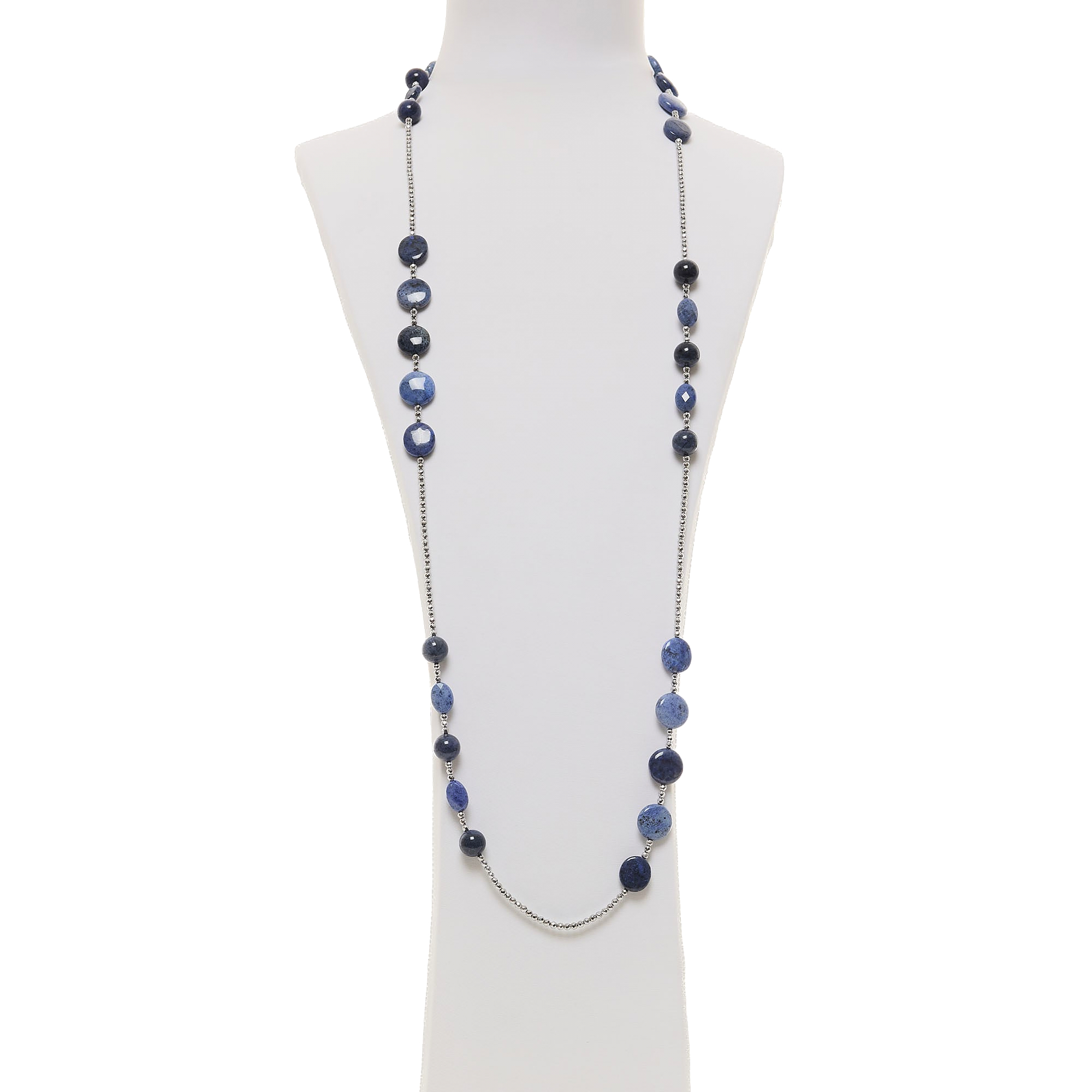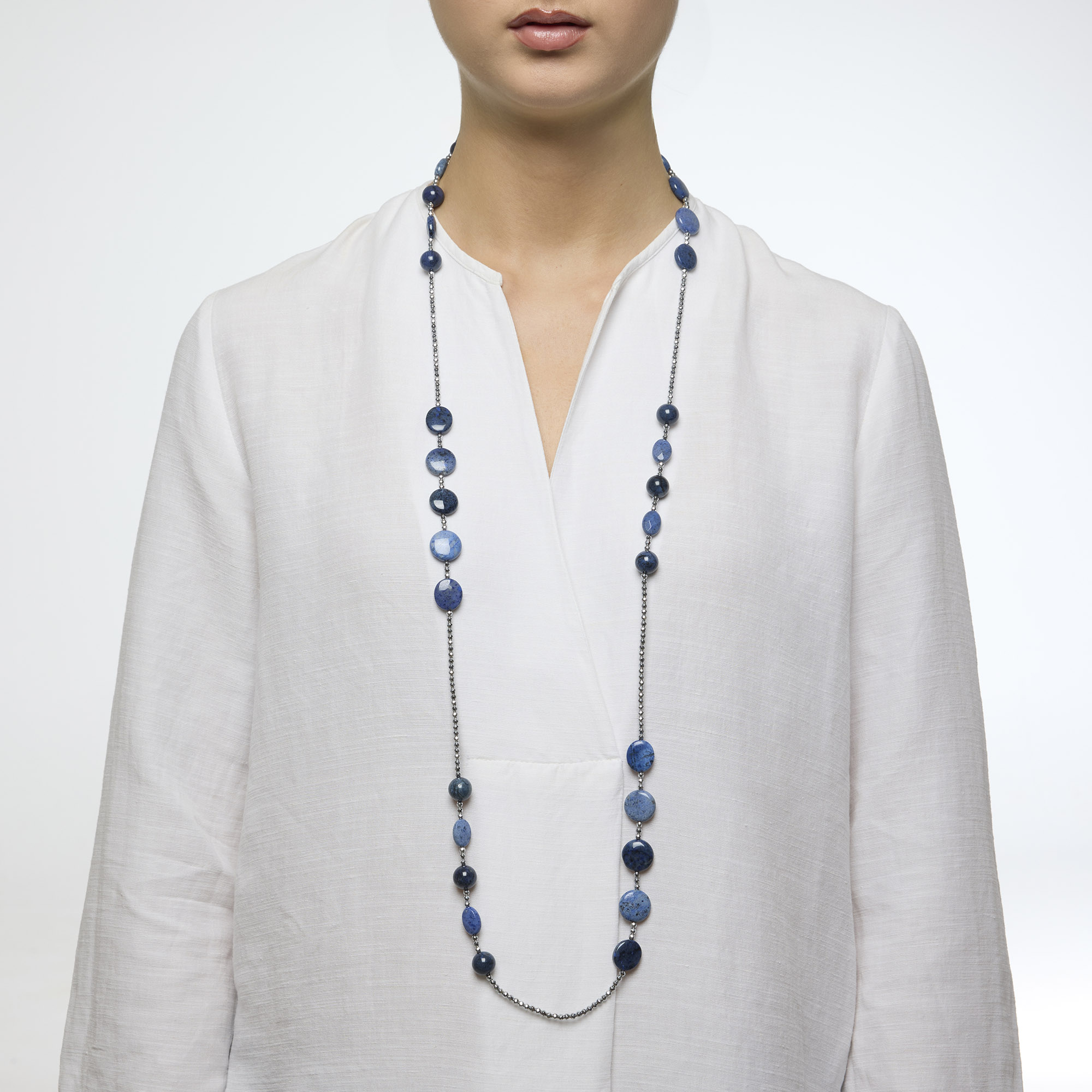Collana lunga infilata in Dumortierite a forme piatte, con Ematite rodiata. Realizzata in Italia.