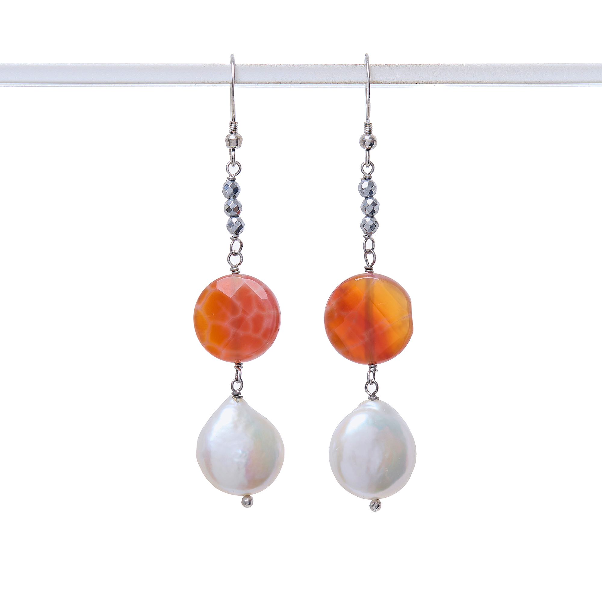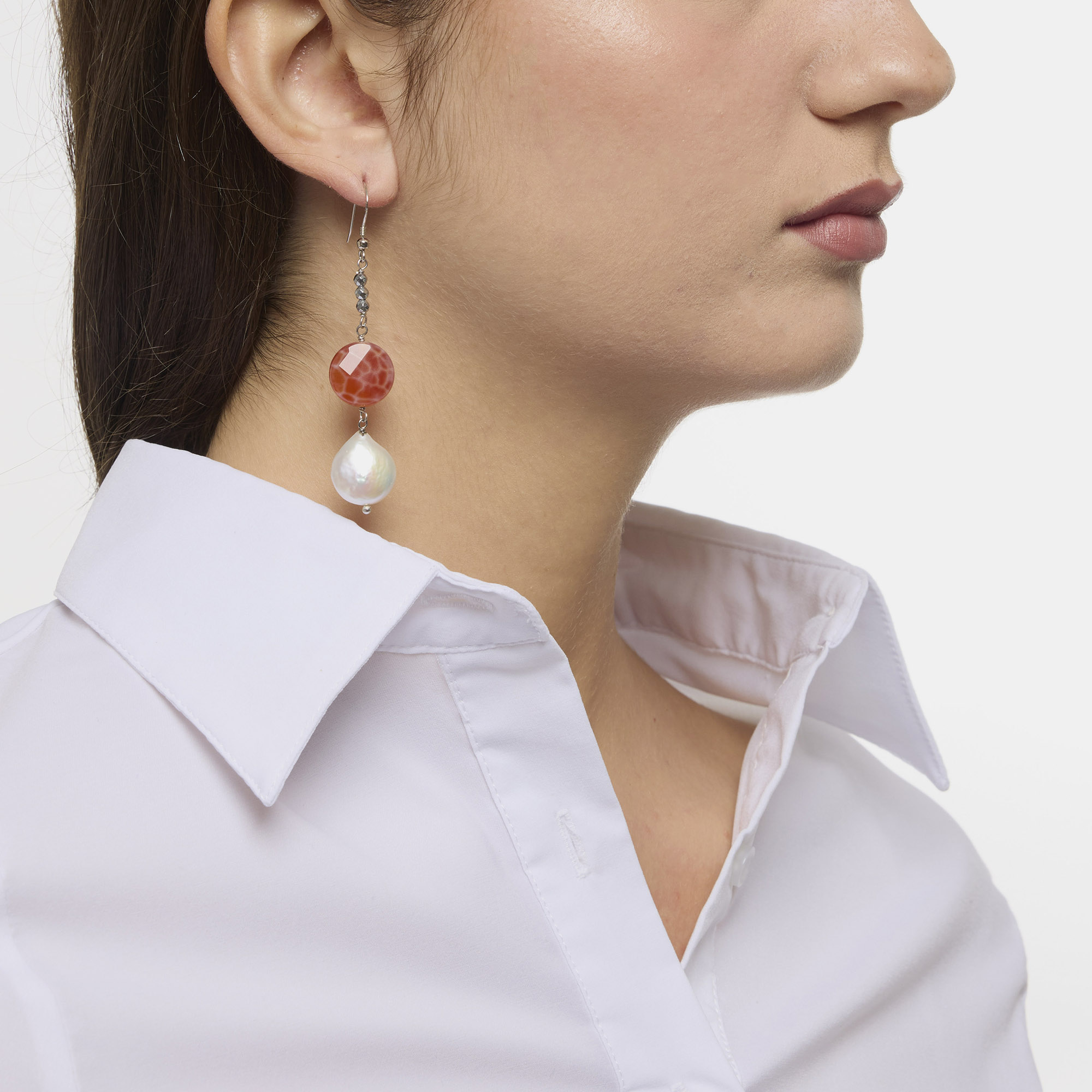 Boucles d’oreilles composées d’Agate de feu et de perles plates d’eau douce, avec hématite rhodiée. Crochet et coupelle en argent 925‰ rhodié. Fabriquées en Italie.
