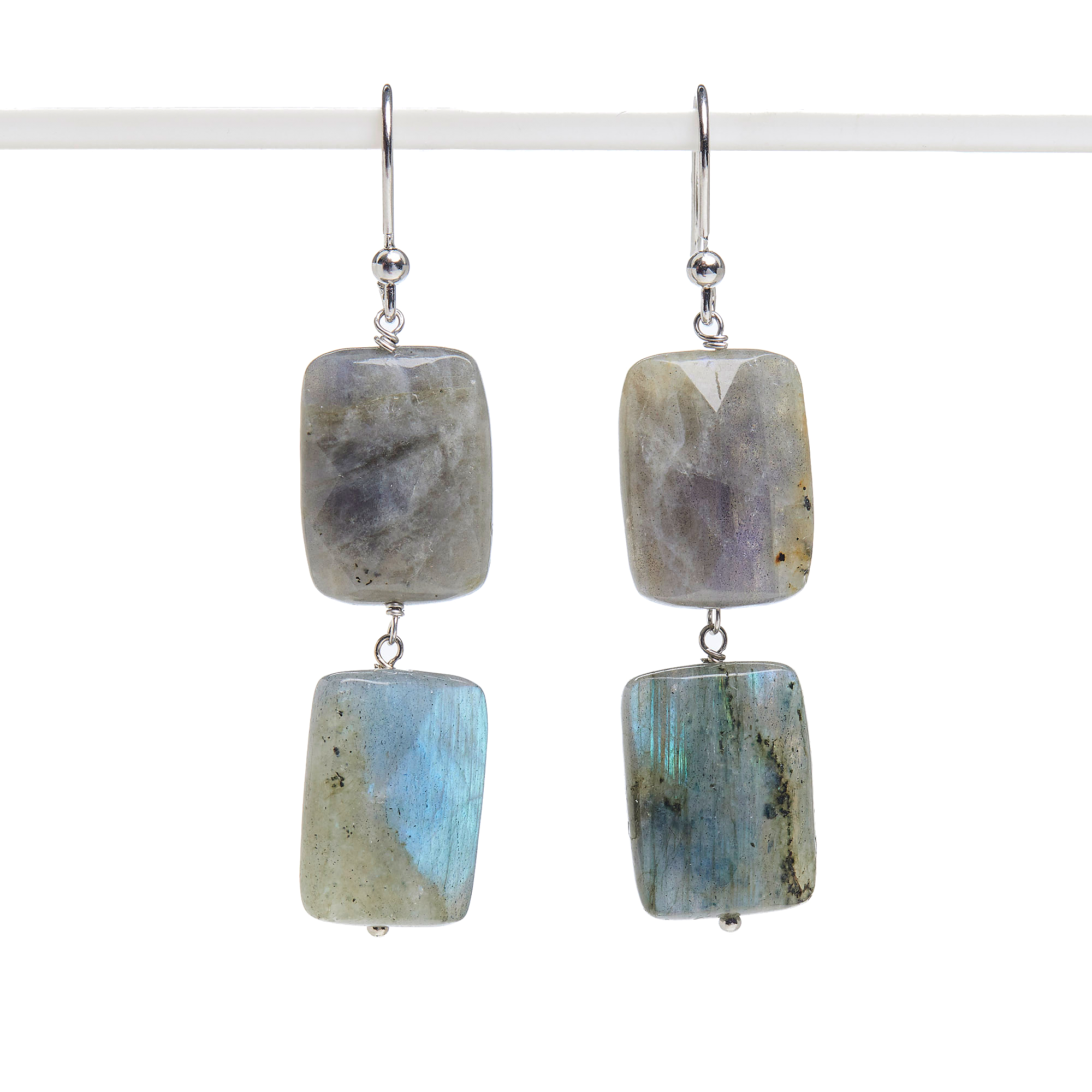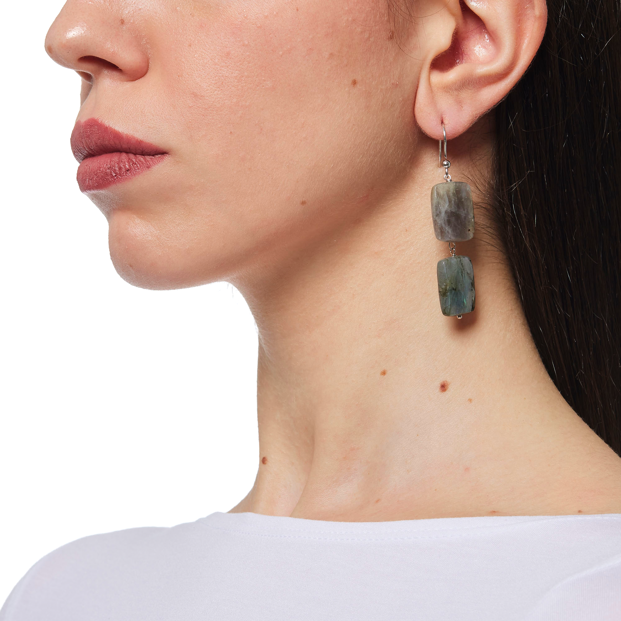 Boucles d’oreilles en labradorite rectangle à facettes avec crochet en argent 925‰ rhodié. Fabriquées en Italie.