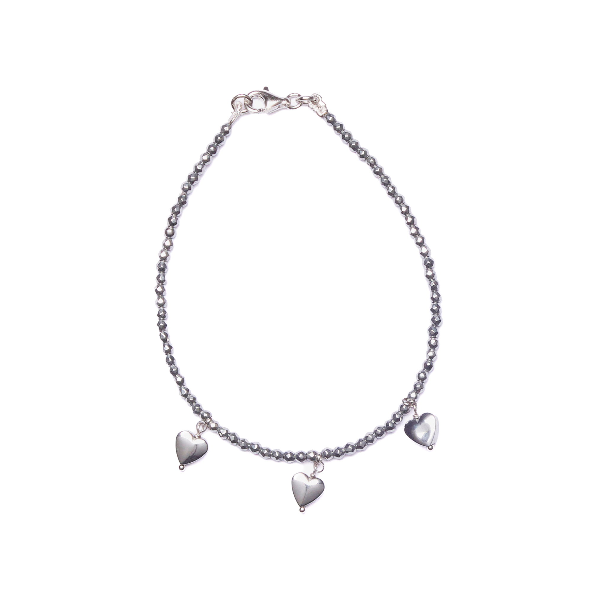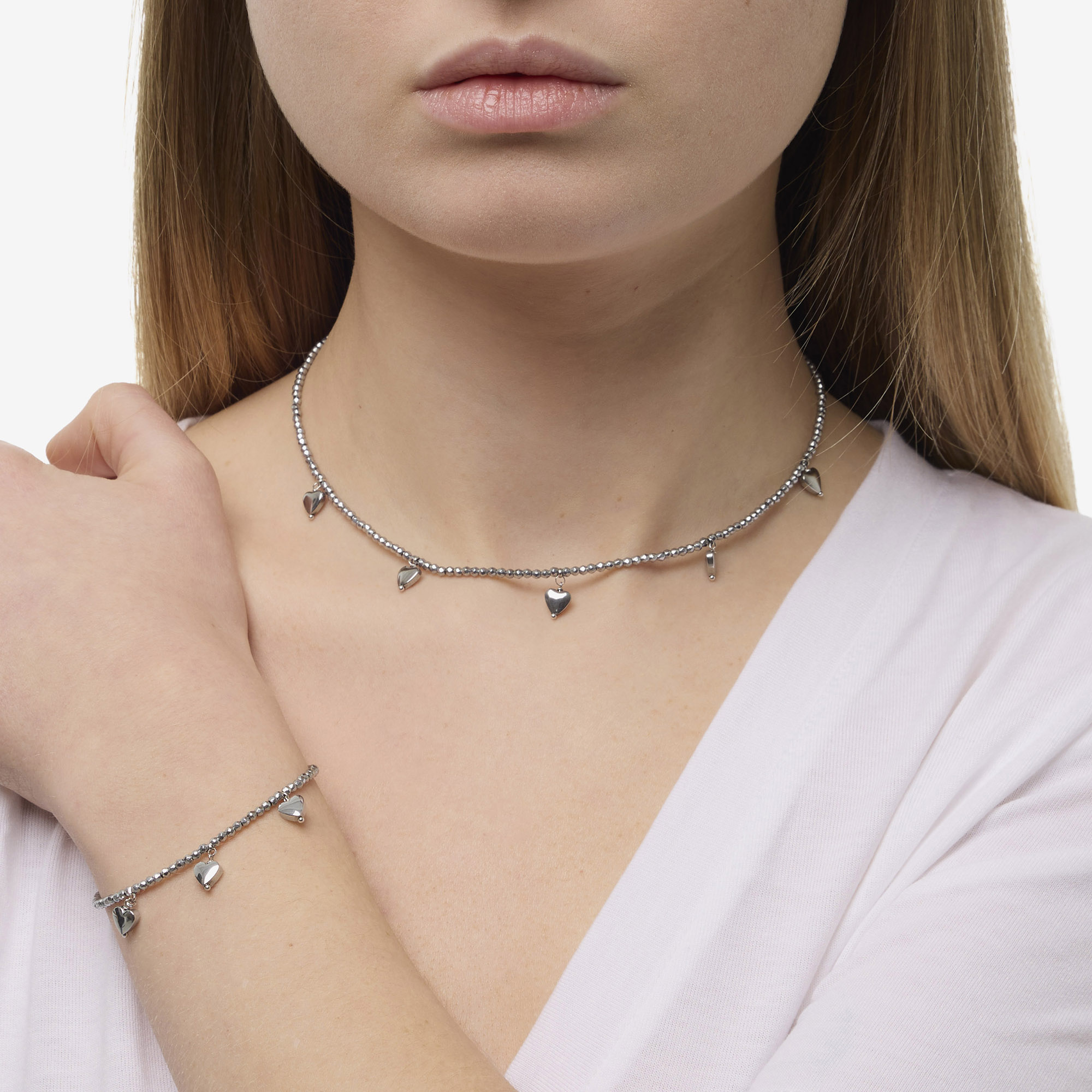 Bracelet enfilé en hématite rhodiée, avec charms pendants en forme de cœur en hématite rhodiée. Fermoir en argent 925‰ rhodié. Fabriqué en Italie.