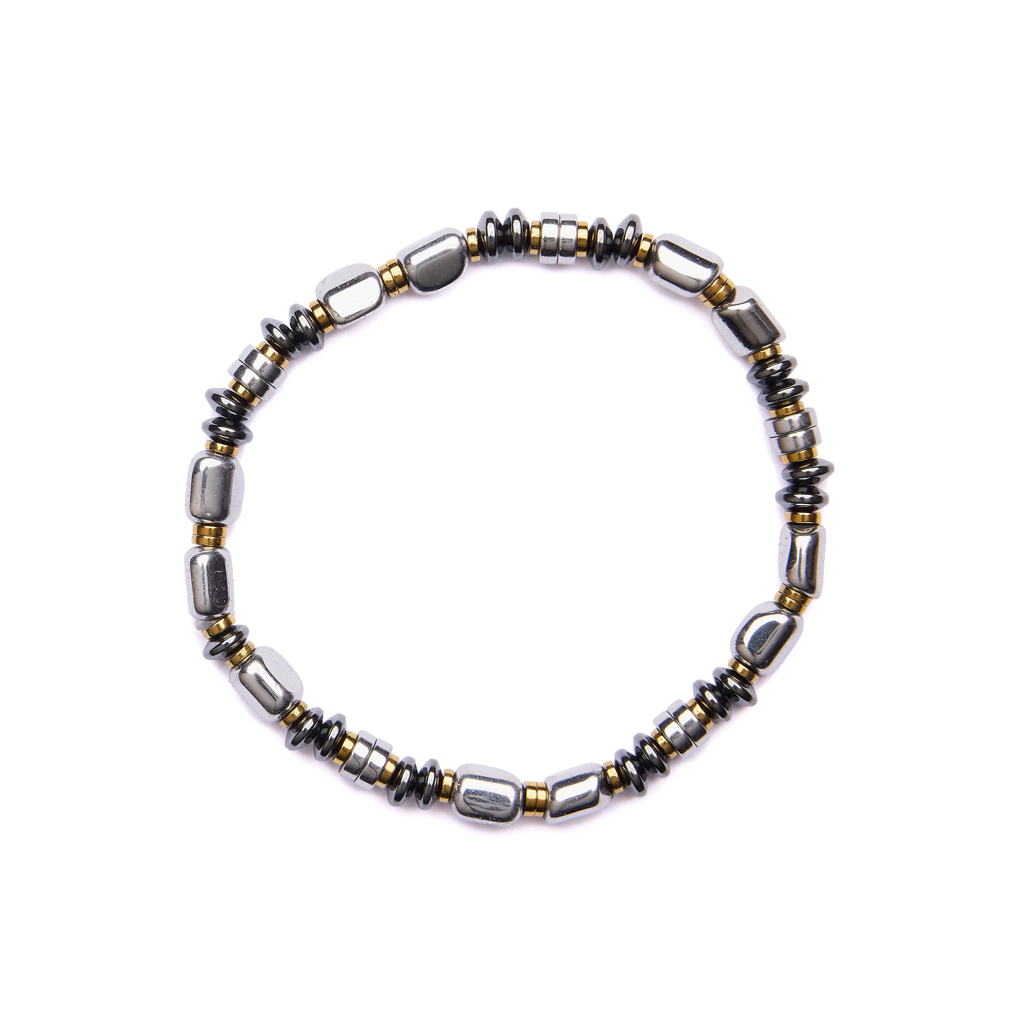 Bracelet homme avec élastique, composé d’hématite rhodiée, dorée et naturelle, de formes et de rondelles assorties. Fabriqué en Italie.