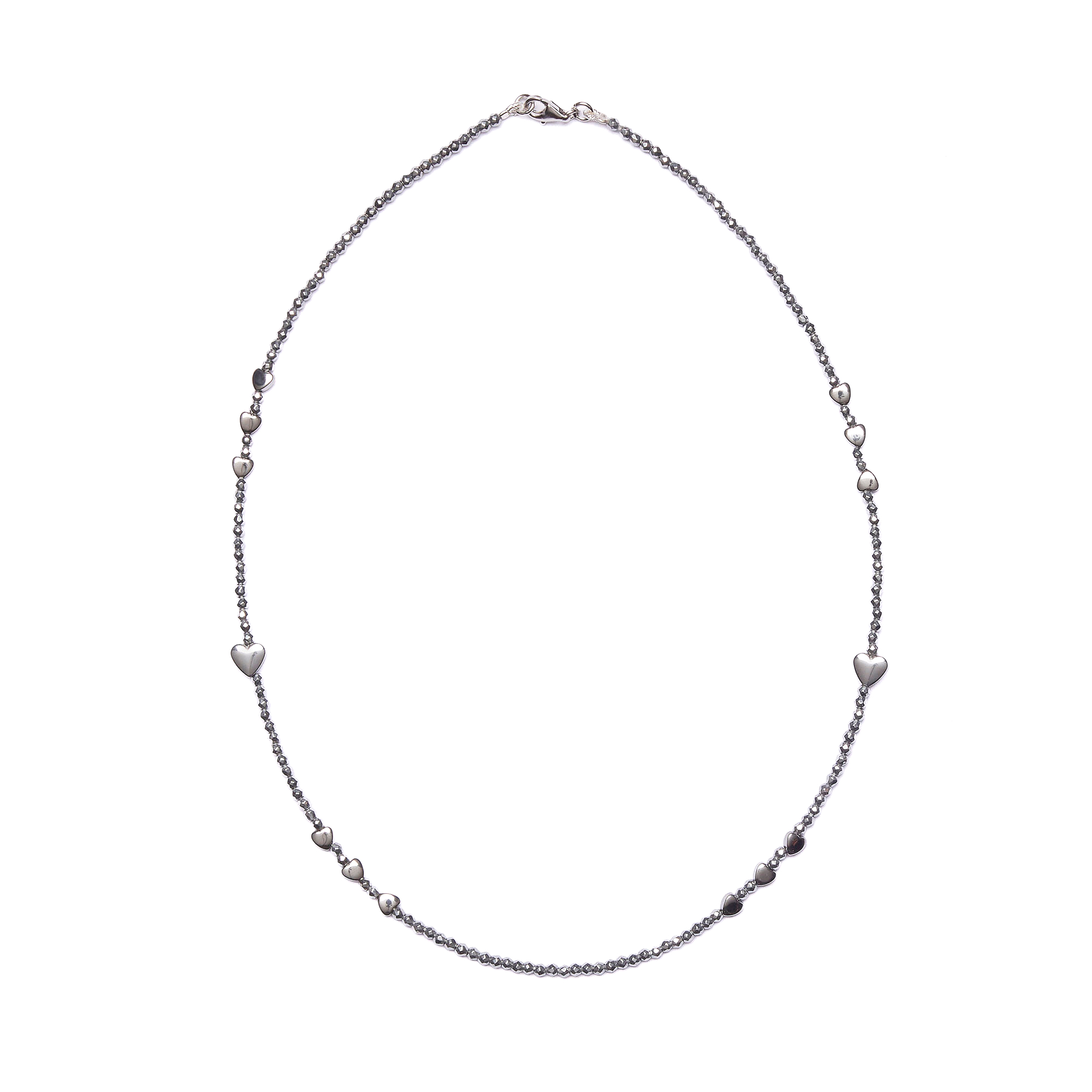 Collier ras-du-cou enfilé en hématite rhodiée avec éléments en forme de cœur en hématite rhodiée. Fermoir en argent 925‰ rhodié. Fabriqué en Italie.