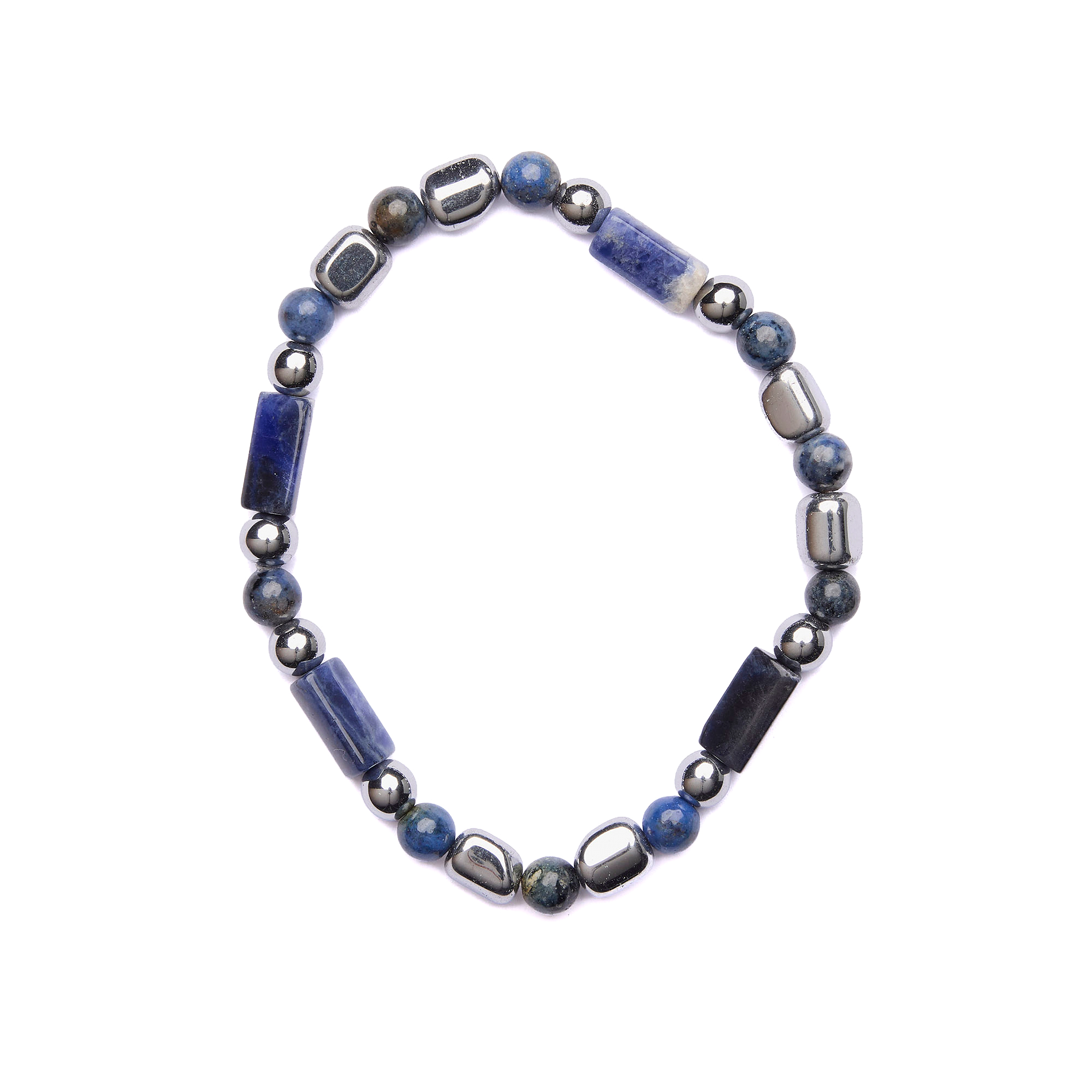 Bracelet homme avec élastique, en hématite rhodiée, avec des sphères de sodalite de 6 mm et des formes assorties. Fabriqué en Italie.