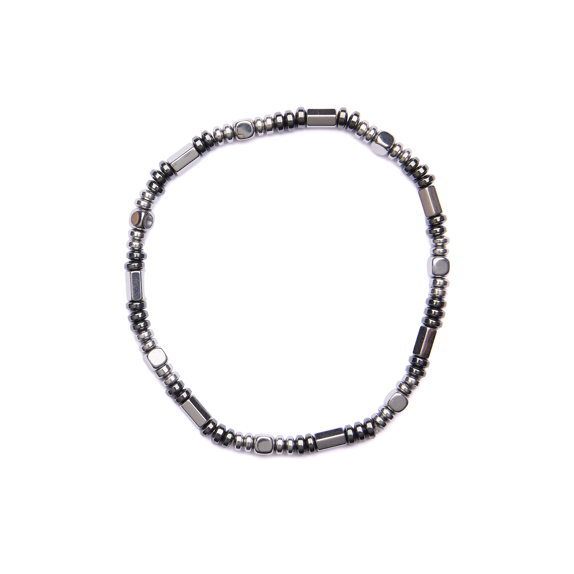 Bracelet homme avec élastique, en hématite rhodiée et de couleur naturelle, en formes assorties et cubes de 4 mm. Fabriqué en Italie.