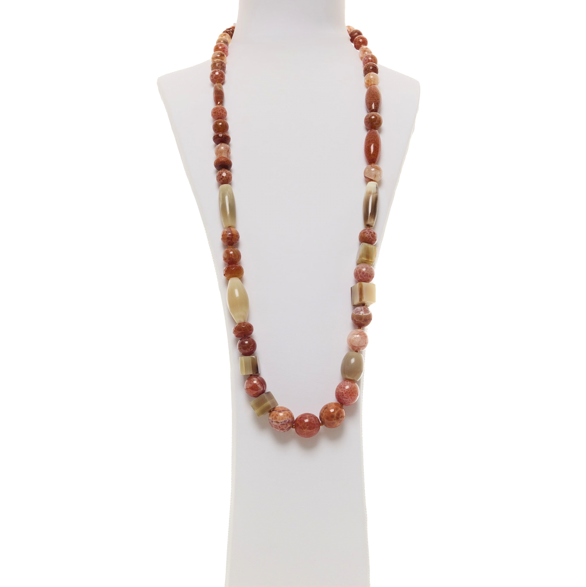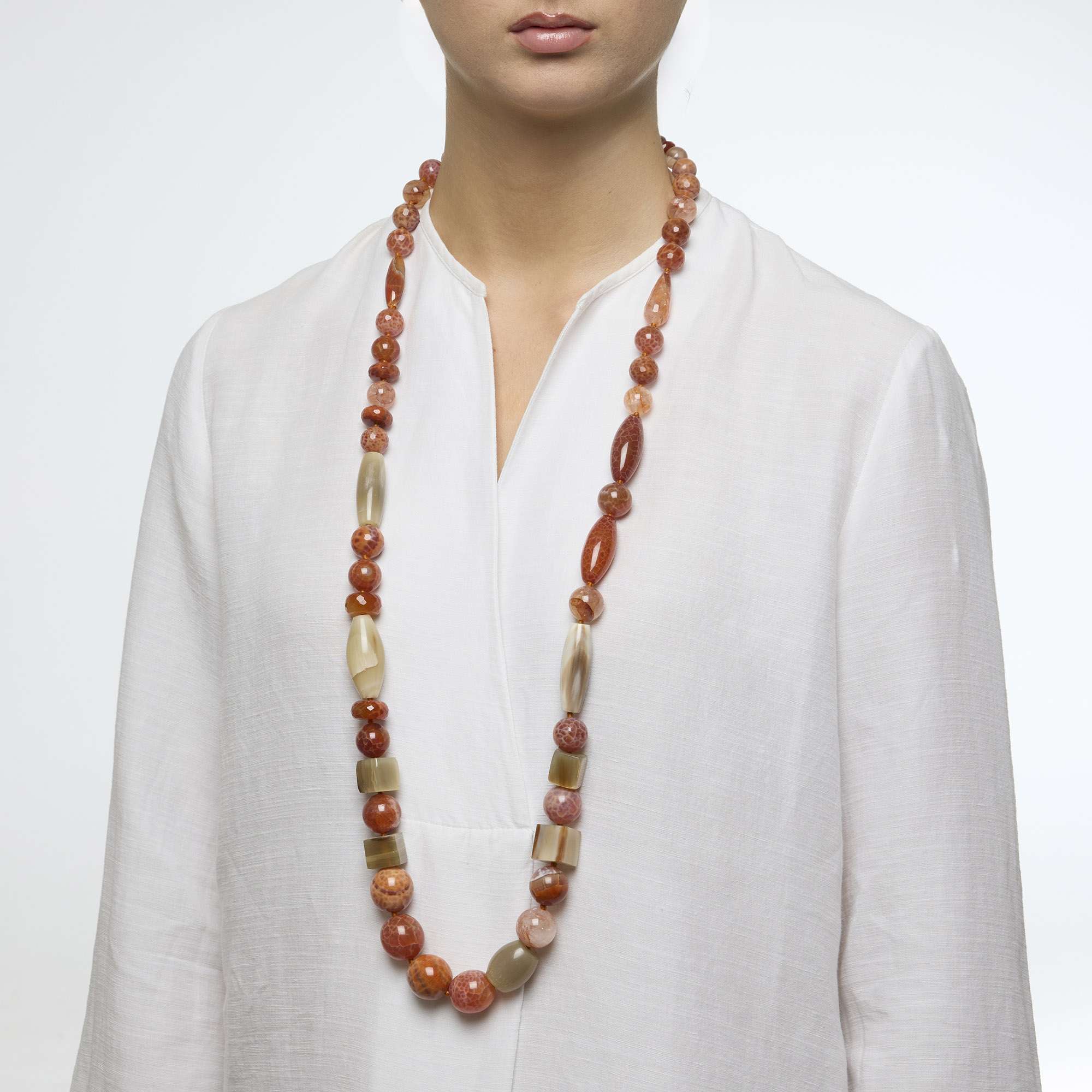 Langgerekte ketting van Vuuragaat en Hematoïde Kwarts, met hoornelementen. Gemaakt in Italië.