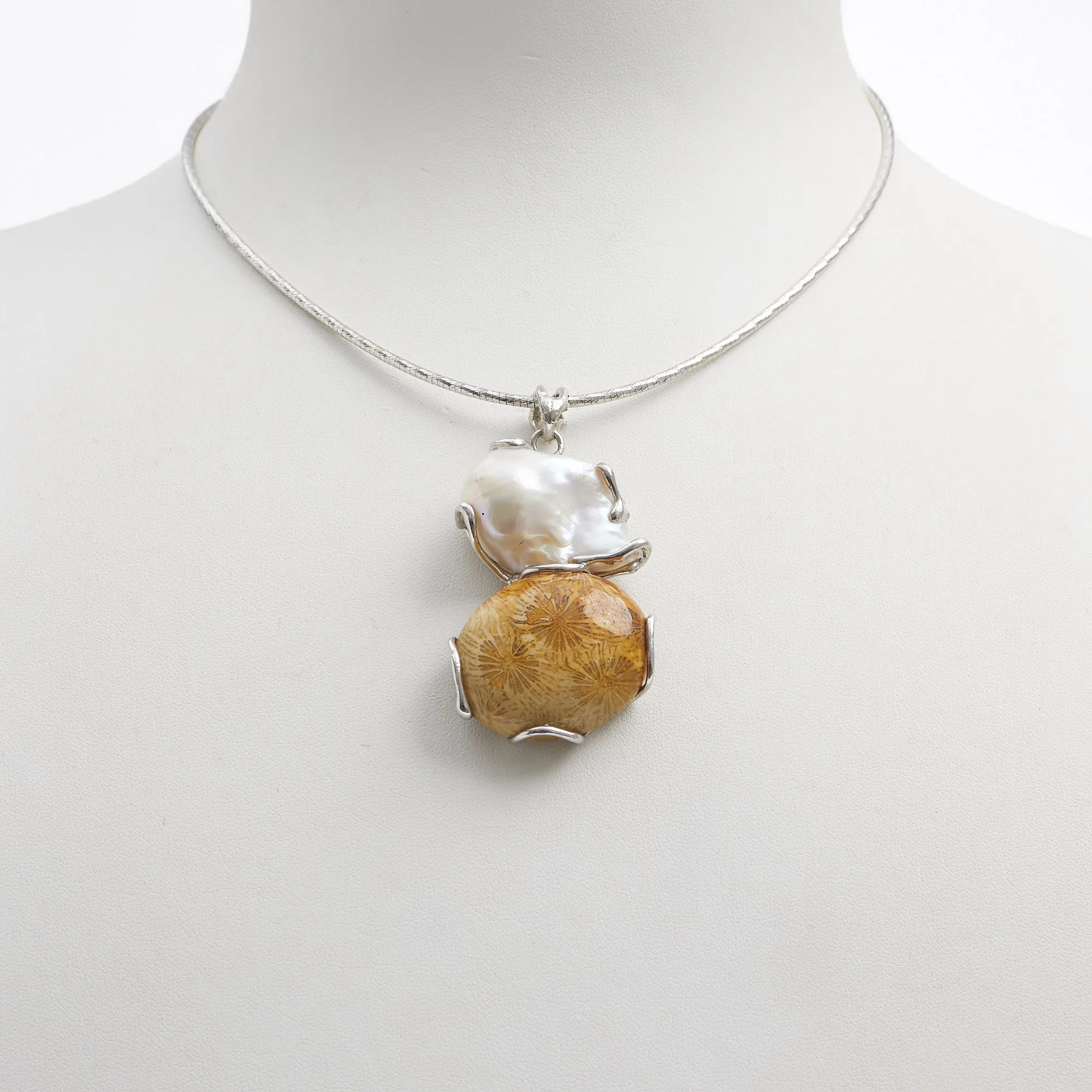Hanger van fossiel koraal en barokparel, gemonteerd in 925‰ gerhodineerd zilver, handgemaakt in Italië. Zilveren halsketting apart verkrijgbaar.