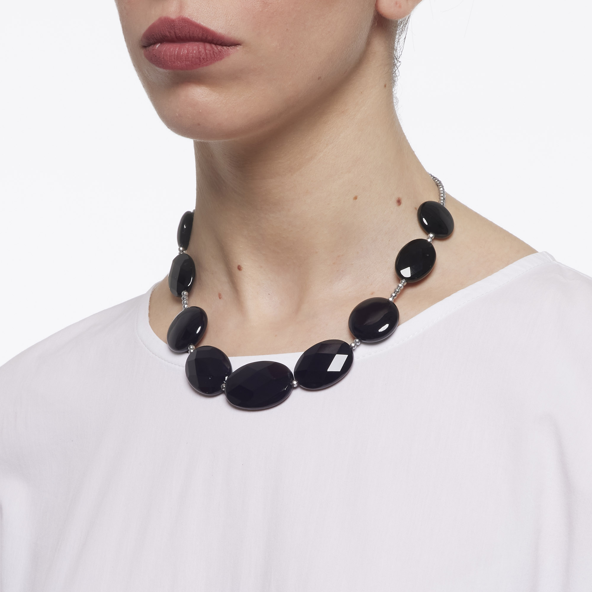 Ketting geregen in platvormige zwarte agaat en gerhodineerd hematiet. Sluiting van gerhodineerd 925‰ zilver. Gemaakt in Italië.