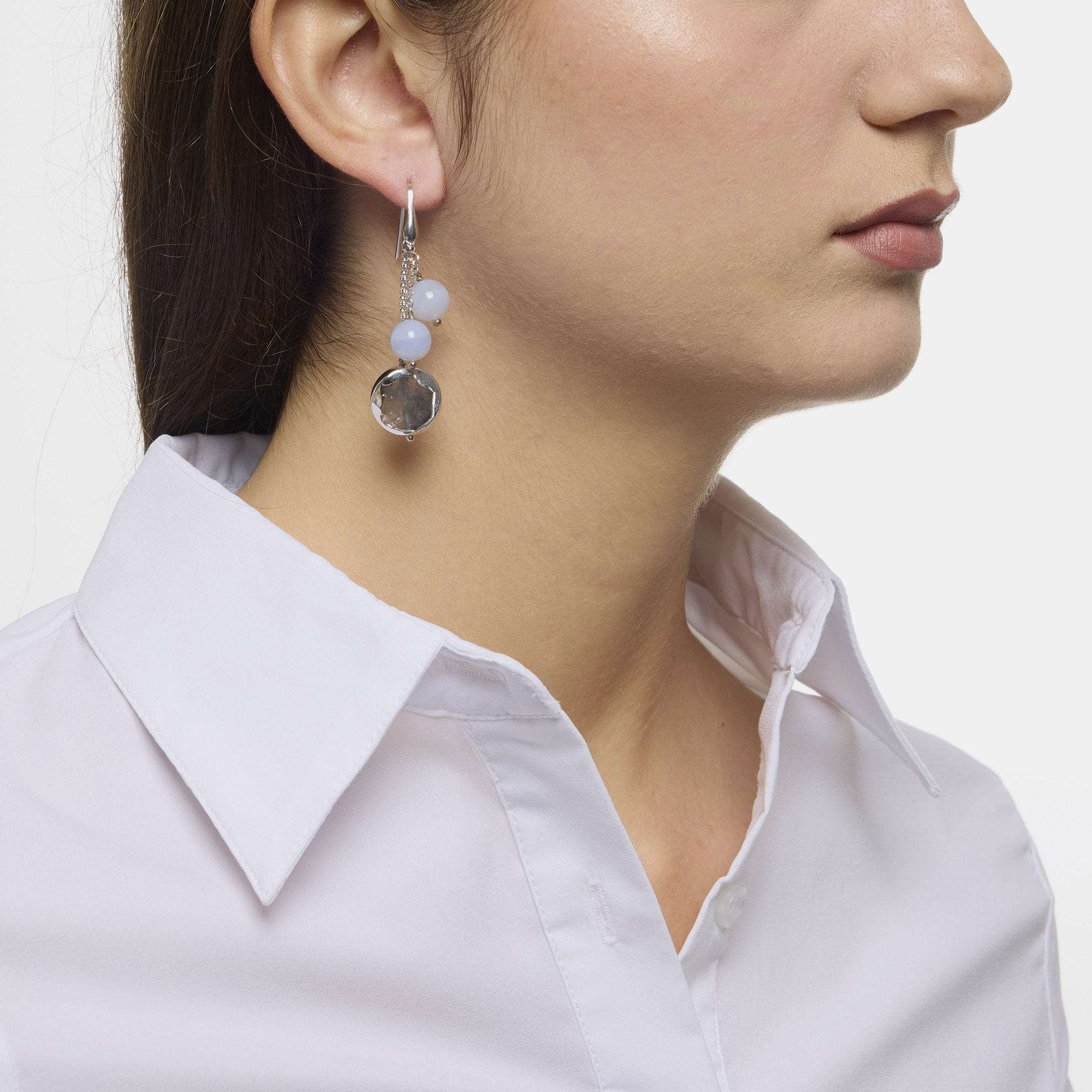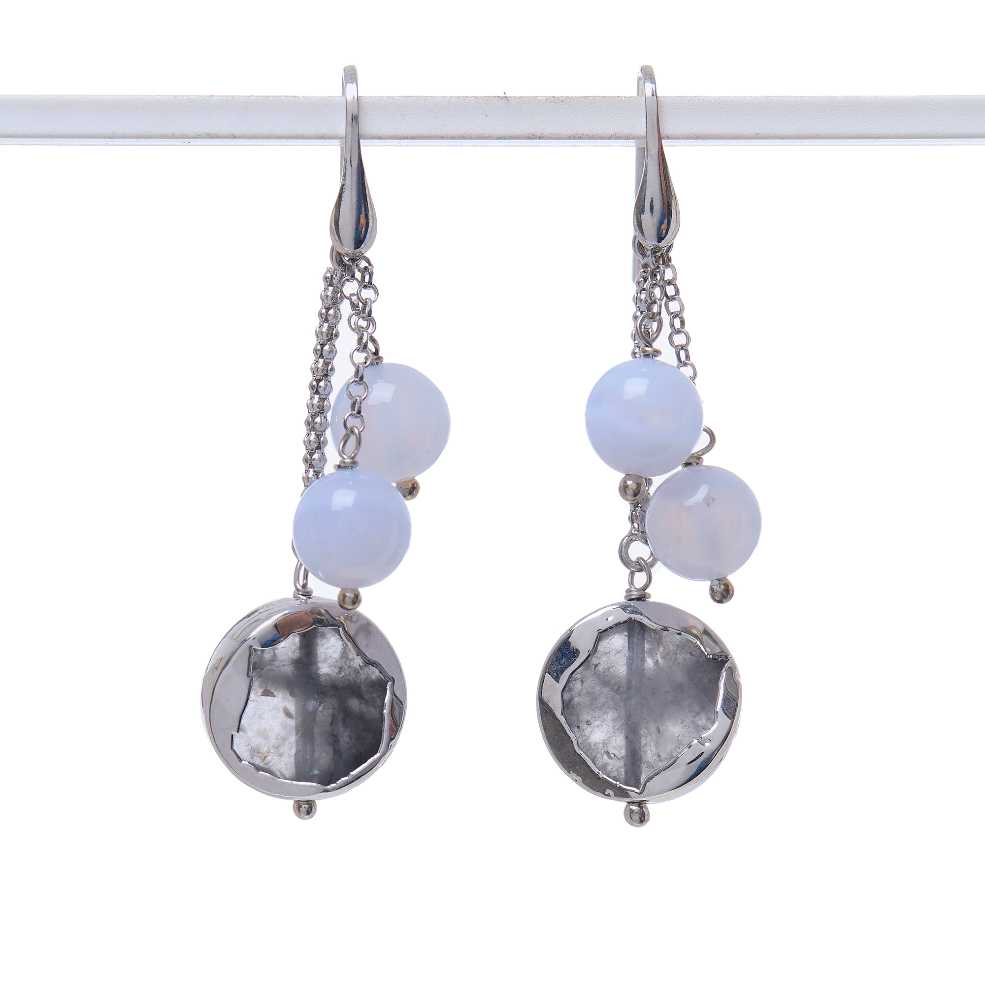 Oorbellen van chalcedoon en grijze kwarts in exclusieve gerhodineerde legering, met 925‰ gerhodineerd zilveren haakje. Gemaakt in Italië.