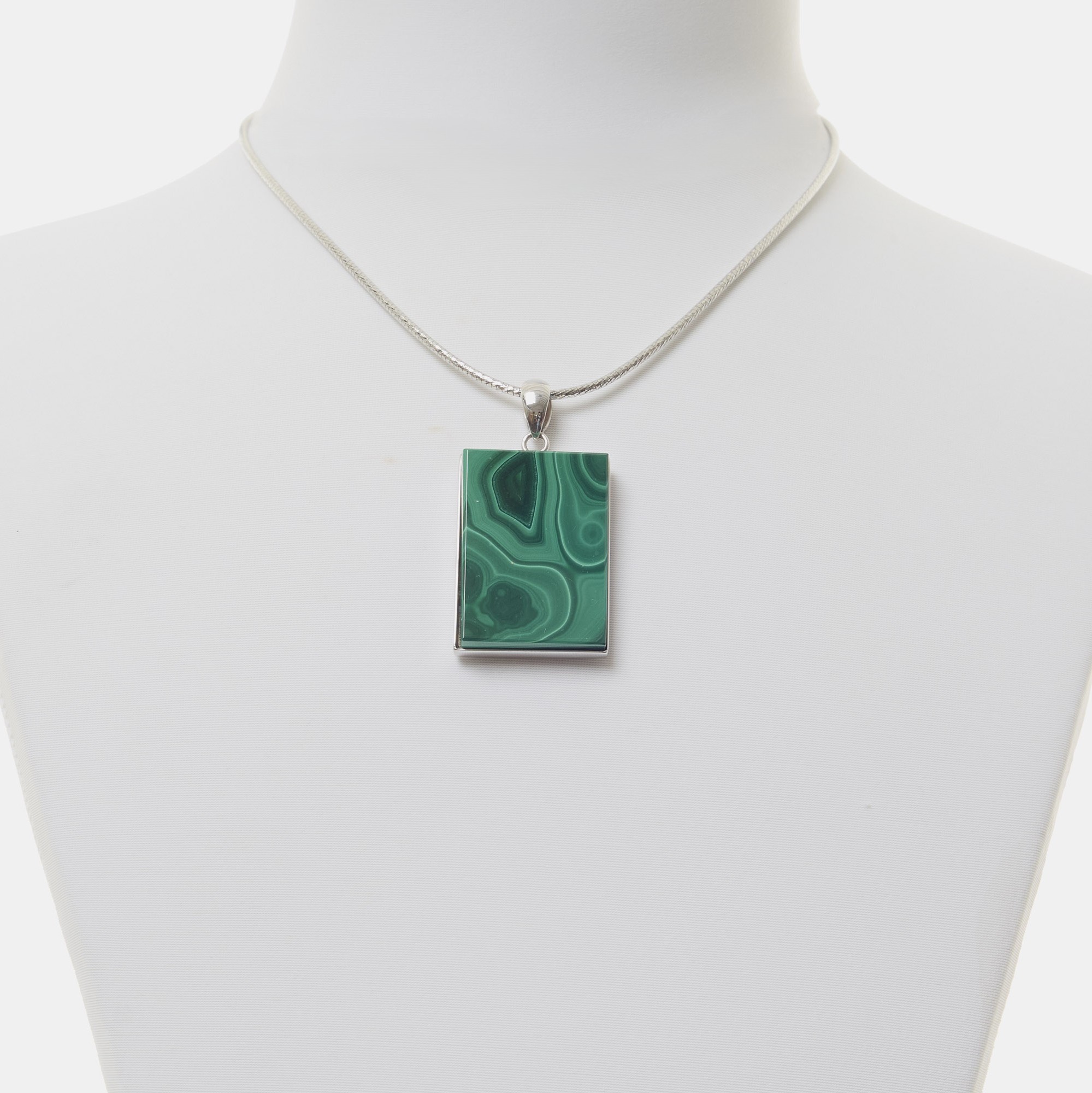 Gerhodineerd 925‰ zilver gemonteerde rechthoekige malachiet hanger, handgemaakt in Italië. Zilveren halsketting apart verkrijgbaar.