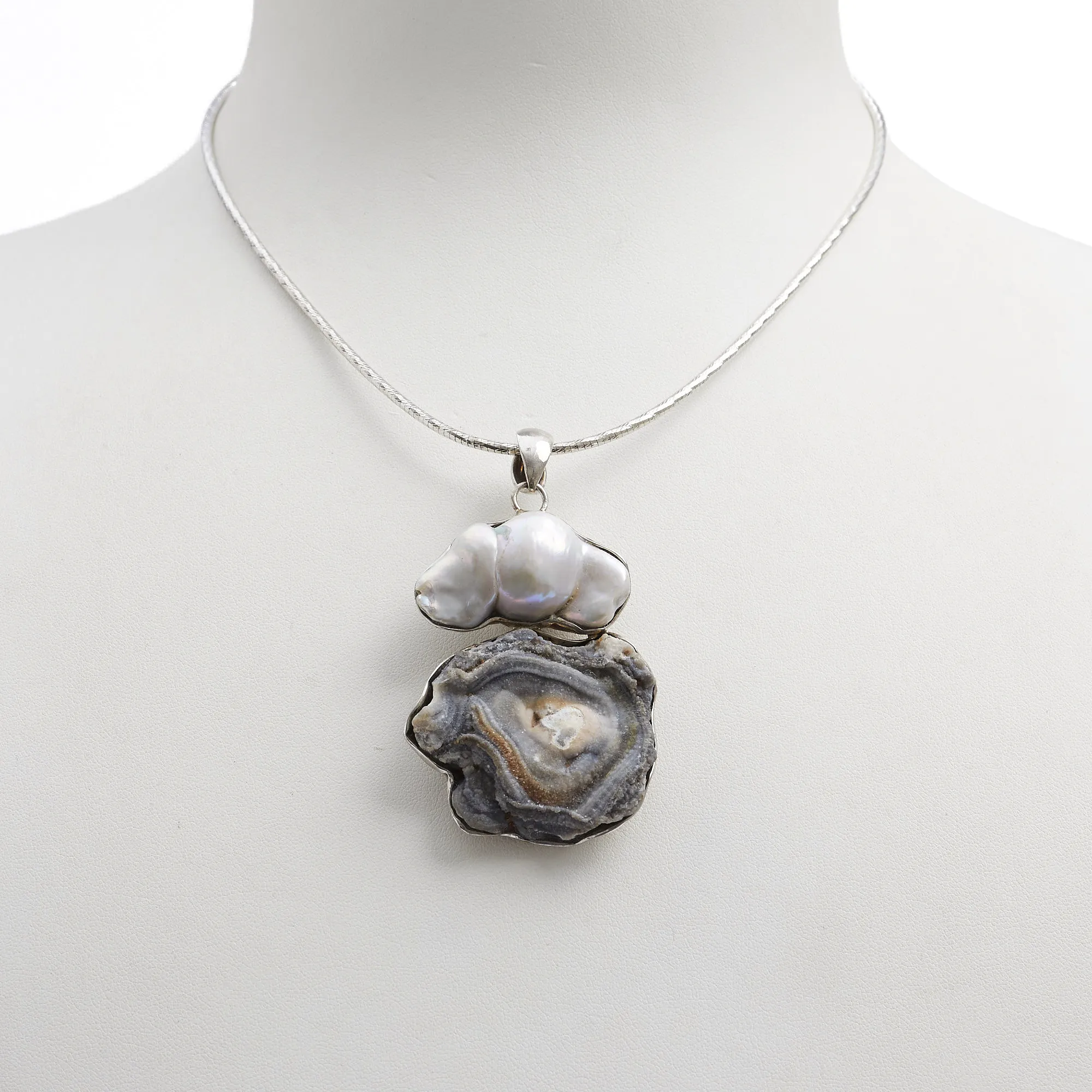 Hanger van Conchina’s en grijze parel, gemonteerd in 925‰ gerhodineerd zilver, handgemaakt in Italië. Zilveren halsketting apart verkrijgbaar.