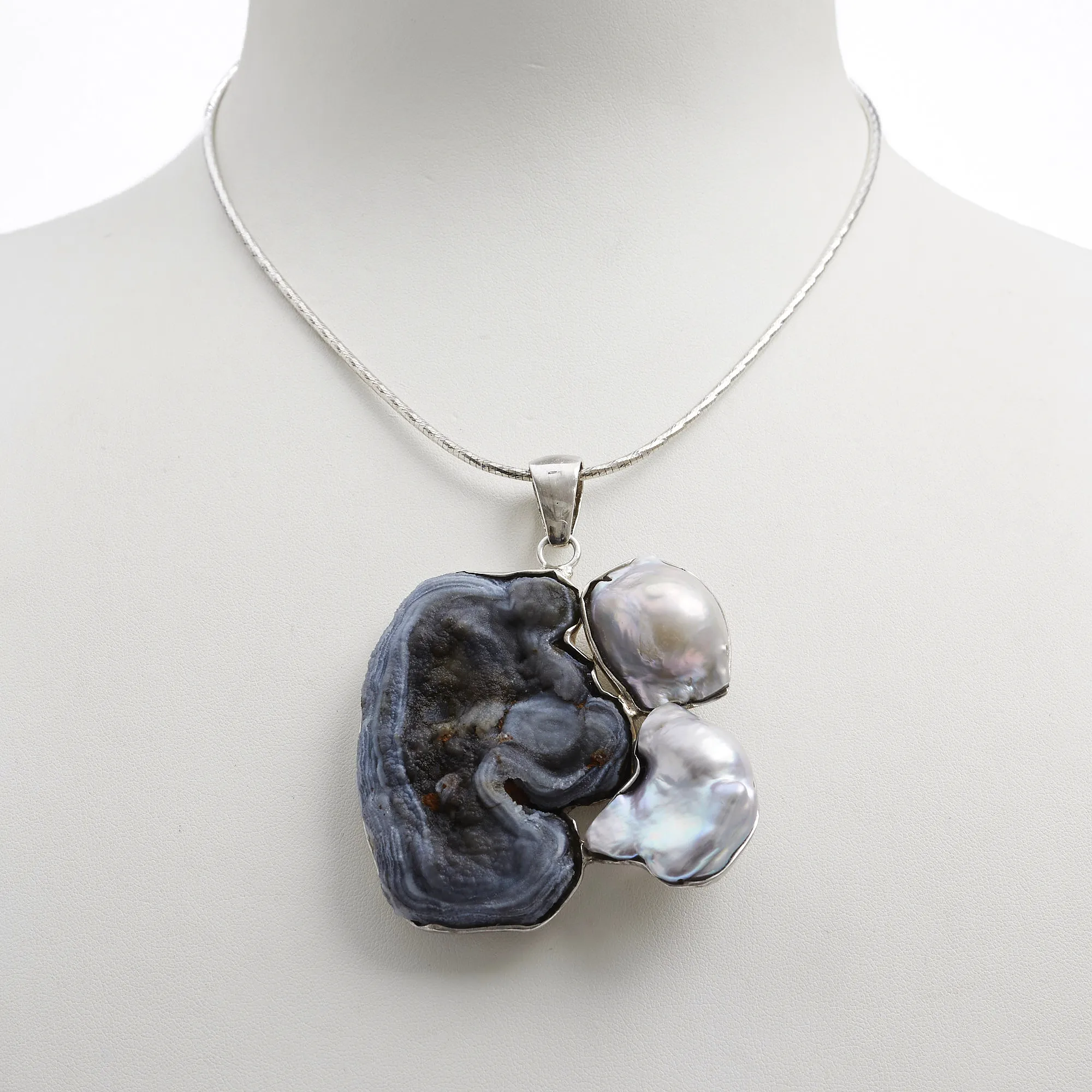 Hanger van grijze Conchina’s en barokparel, gemonteerd in gerhodineerd 925‰ zilver, handgemaakt in Italië. Zilveren halsketting apart verkrijgbaar.