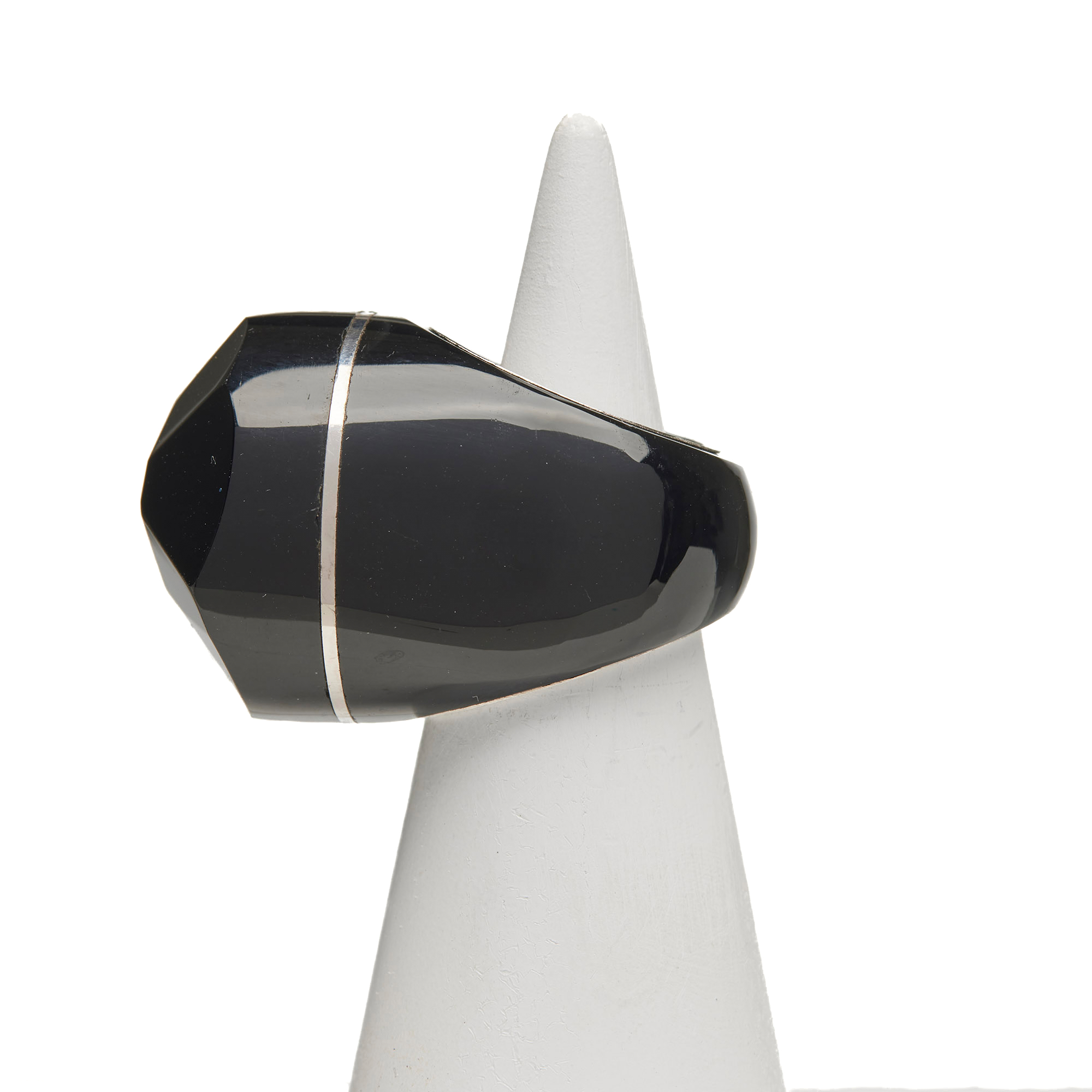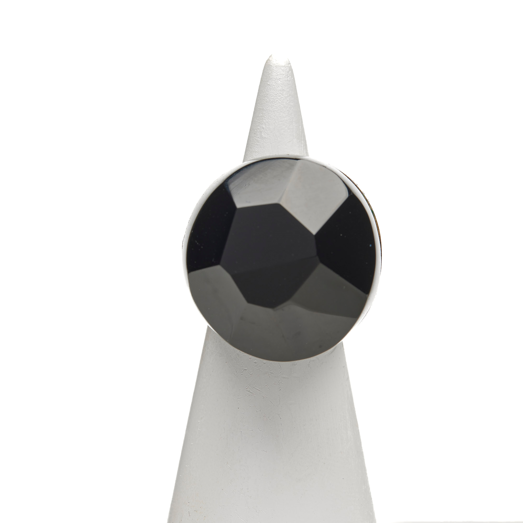 925‰ gerhodineerd zilveren ring, met schacht en gefacetteerde cabochon van zwarte agaat.