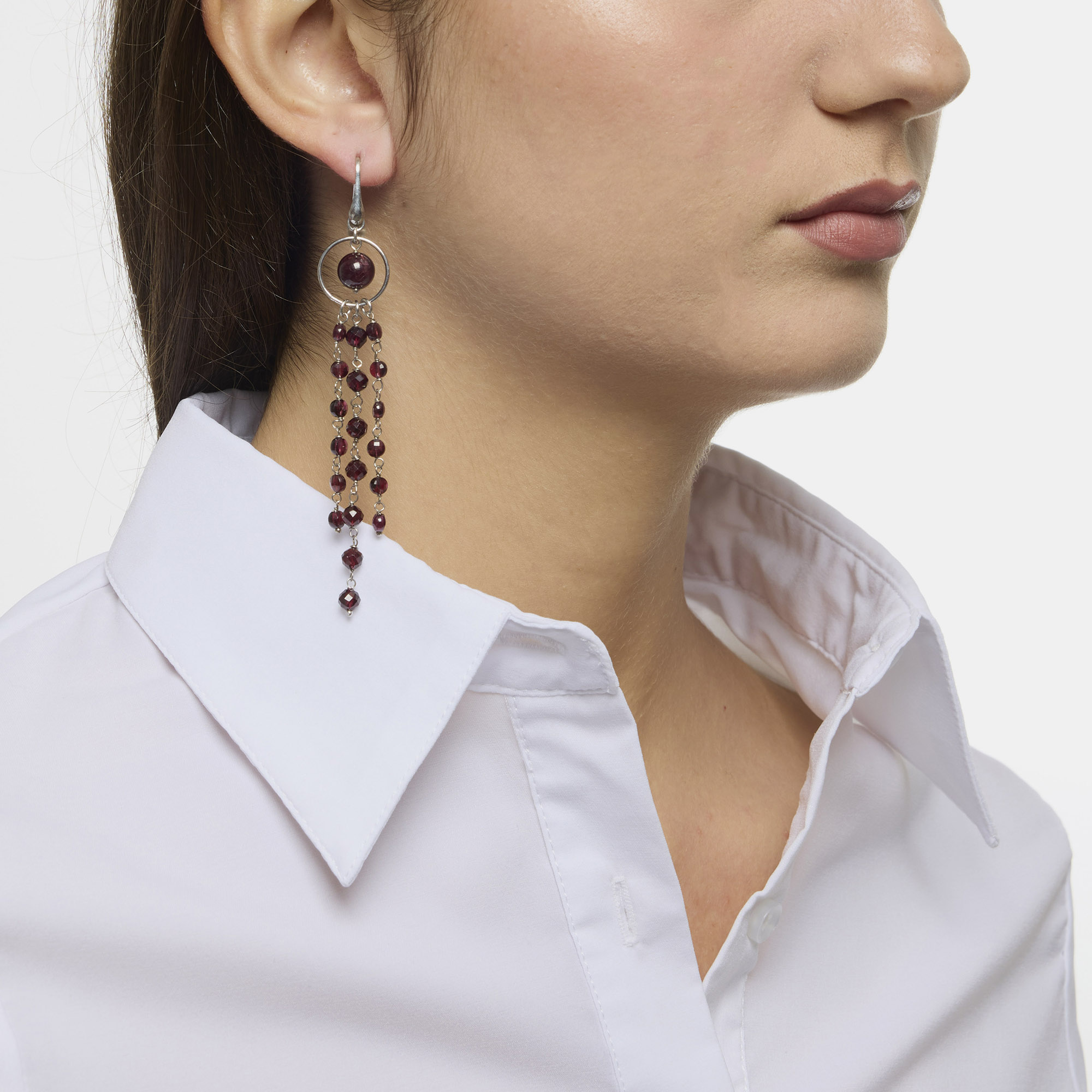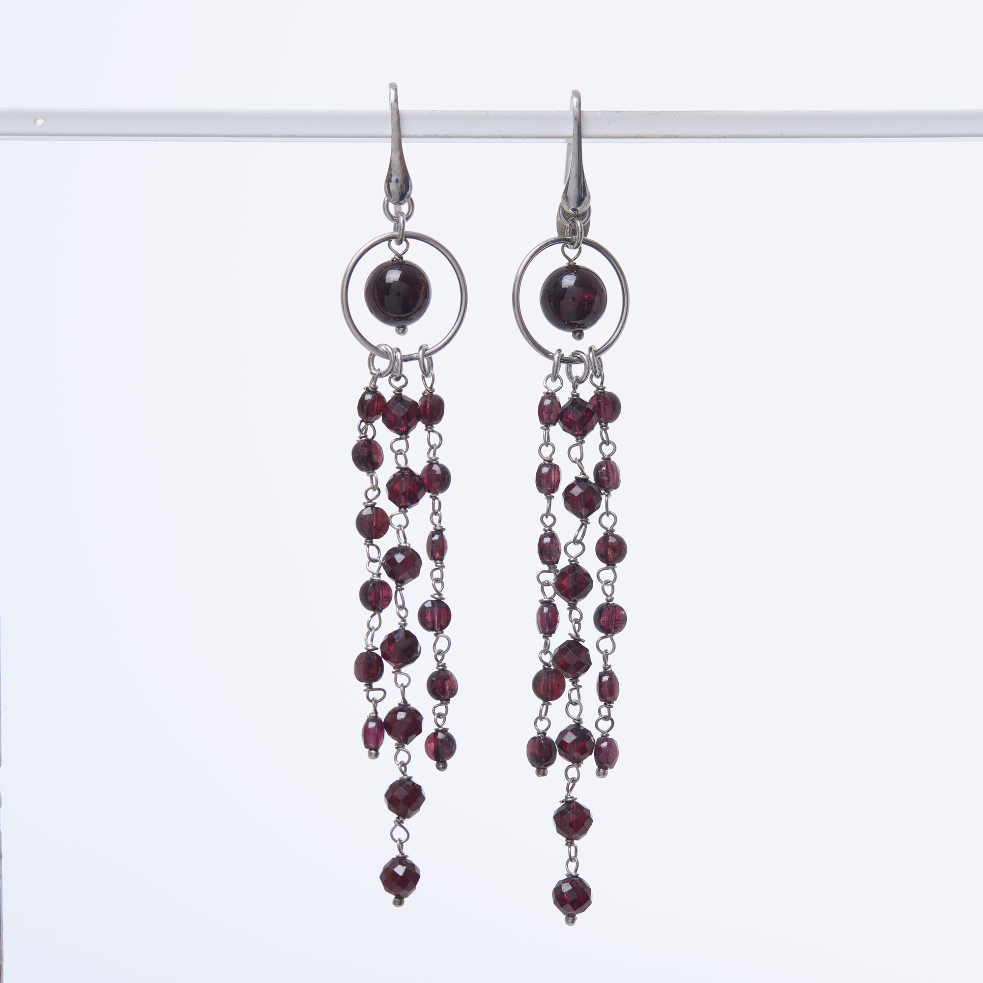 Orecchini a tre fili pendenti rilegati in argento e Granato, con amo in Argento 925‰ rodiato. Realizzati in Italia.