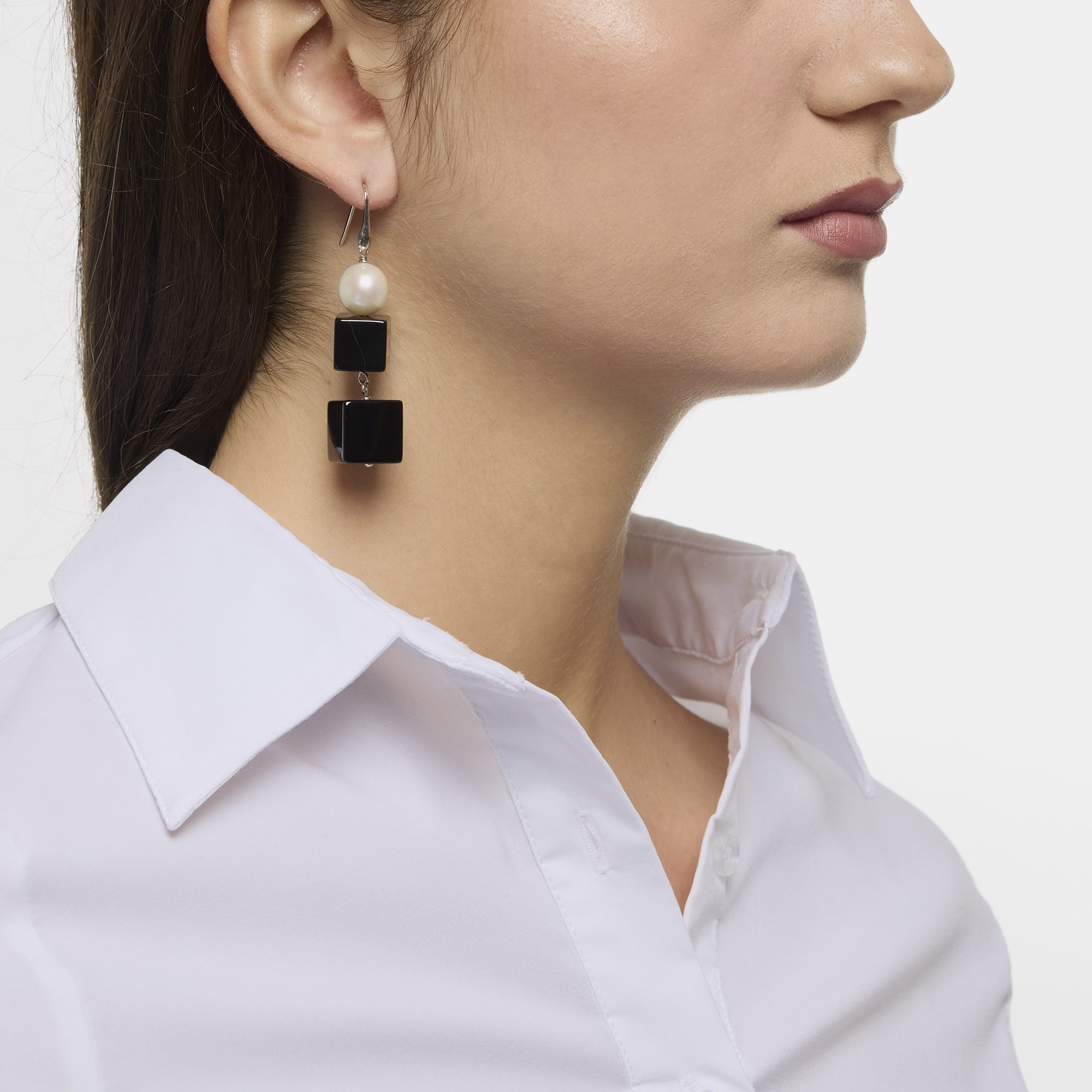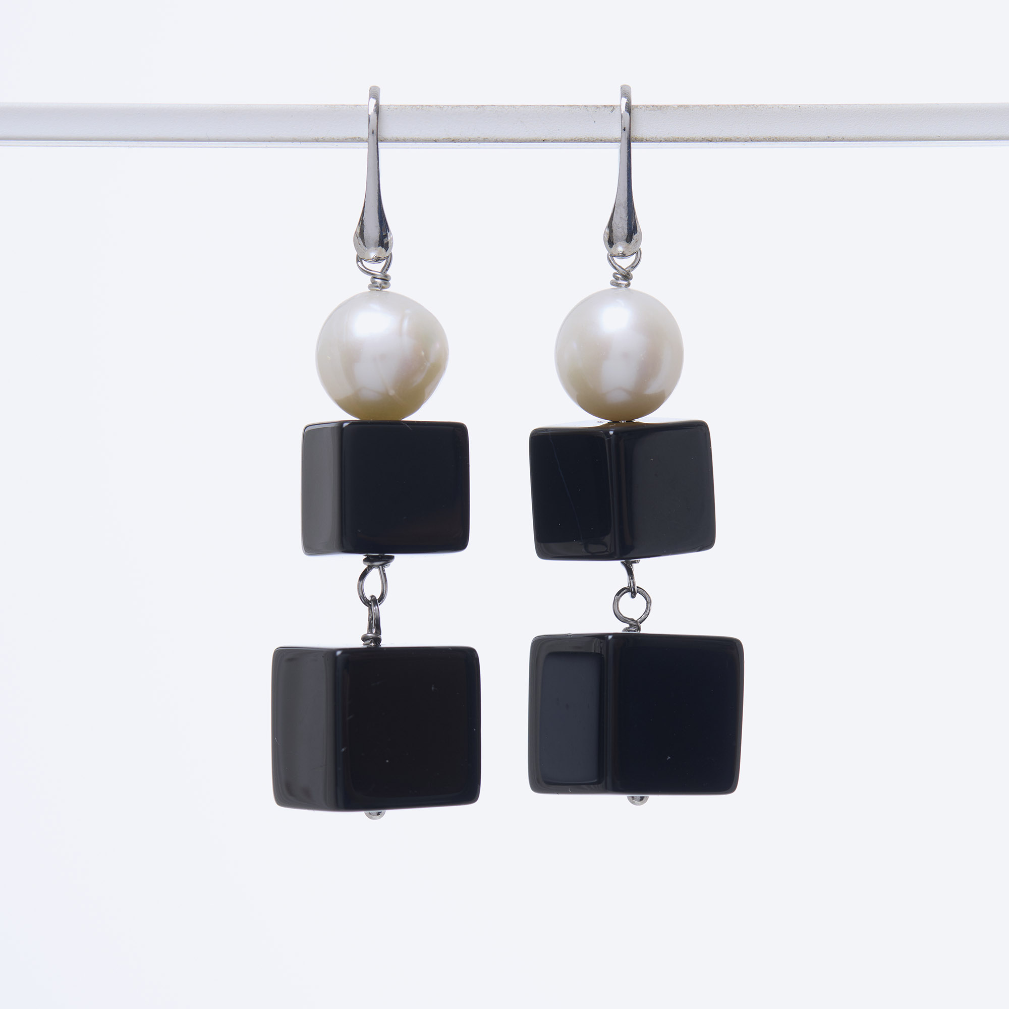 Orecchini in Agata Nera e Perle d’acqua dolce, con amo in argento 925‰ rodiato. Realizzati in Italia.