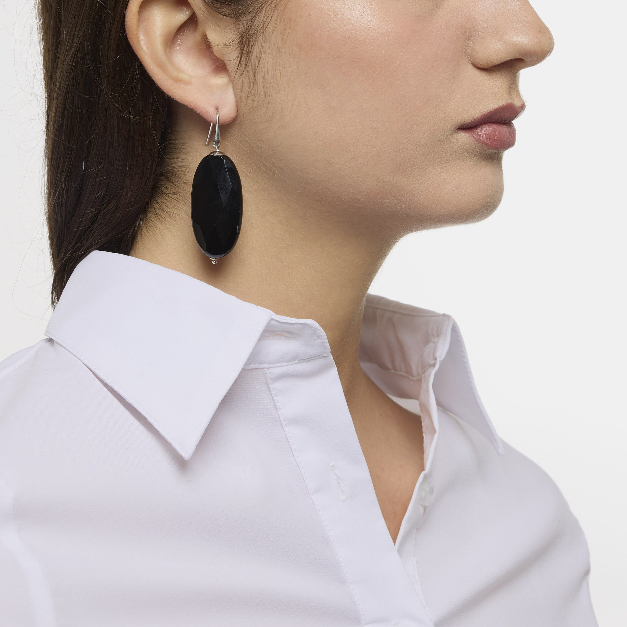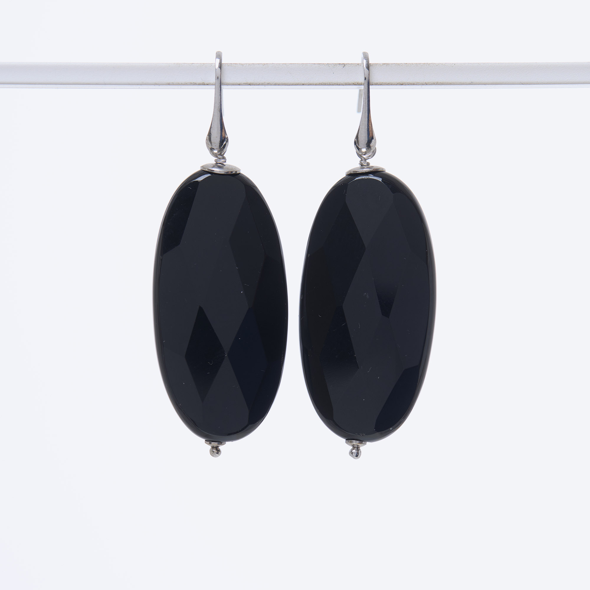 Orecchini in Agata Nera ad ovale piatto sfaccettato, con amo in argento 925‰ rodiato. Realizzati in Italia.