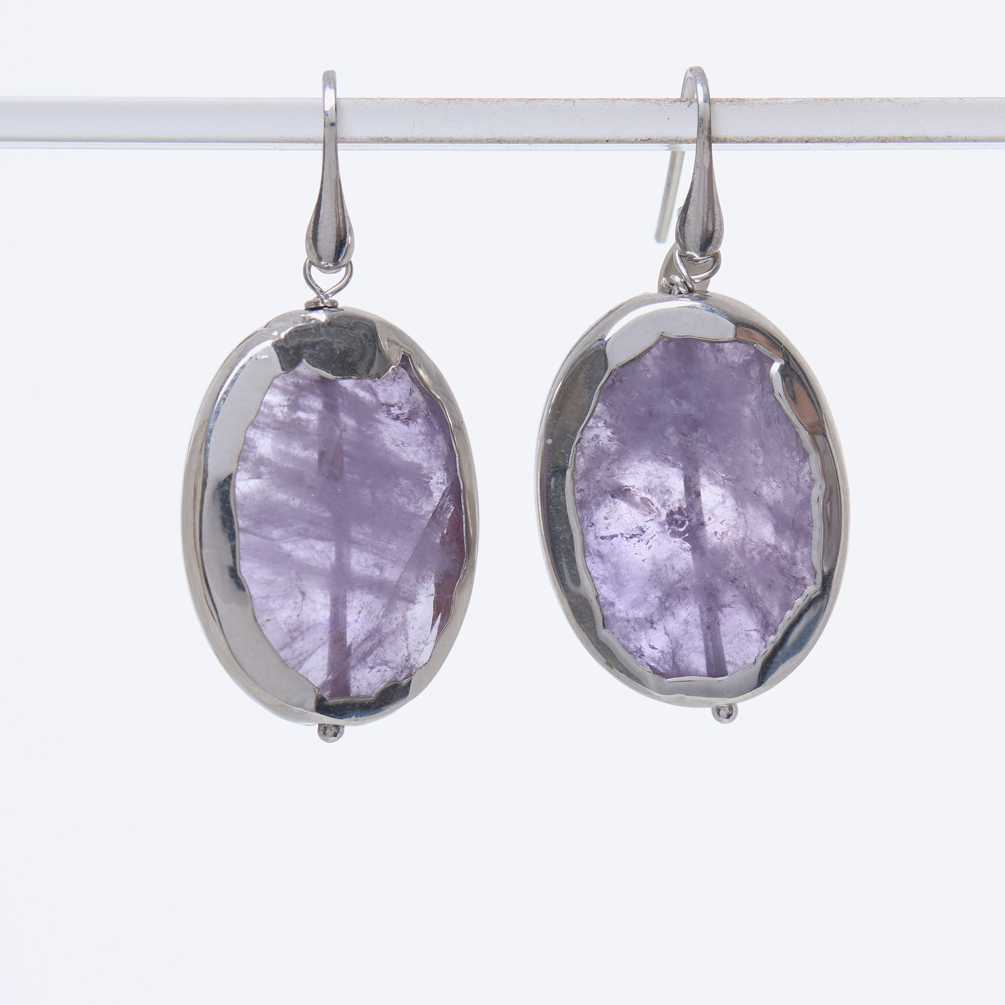 Orecchini in Ametista a forma ovale con elementi scontornati in lega esclusiva rodiata ed amo in argento 925‰ rodiato. Realizzati in Italia.