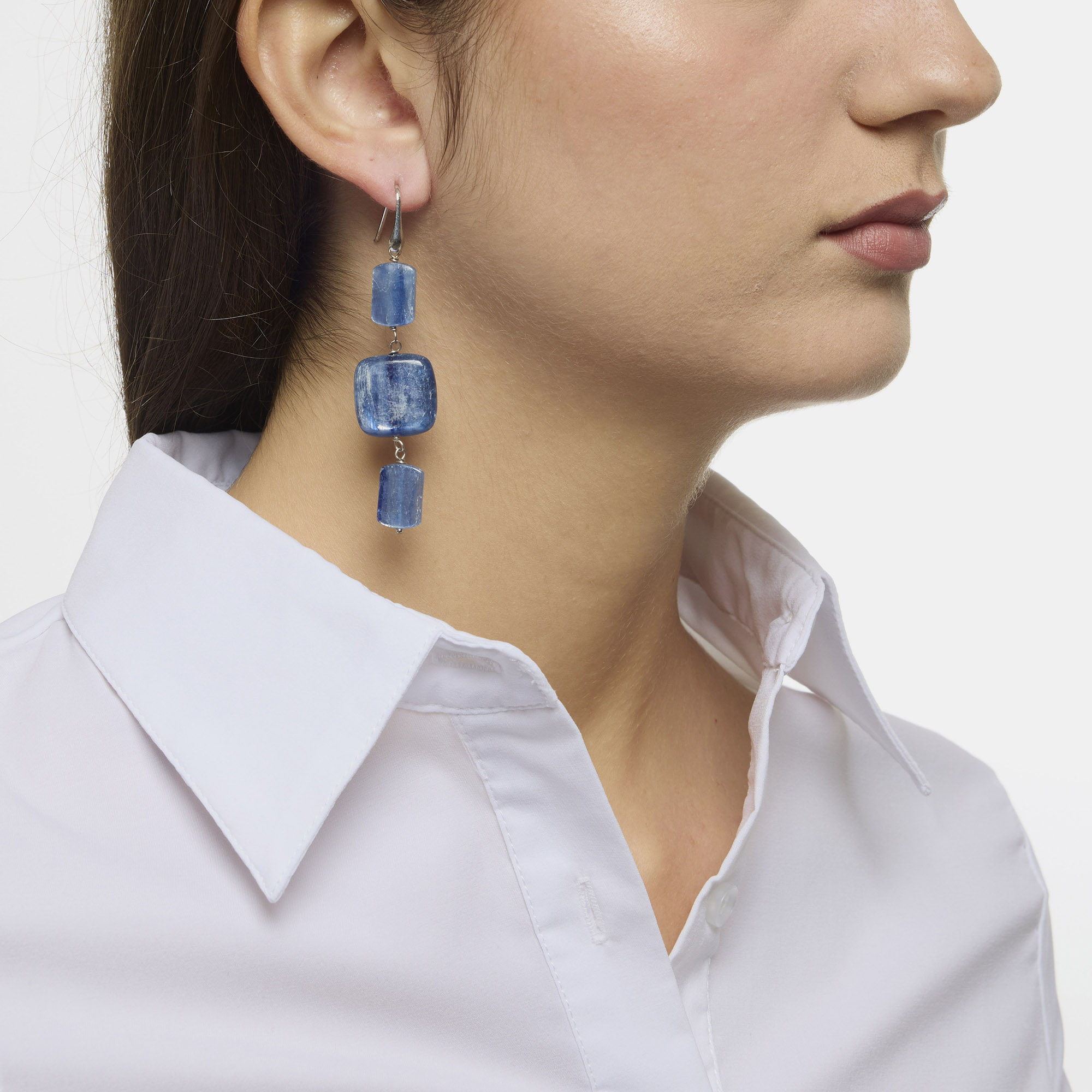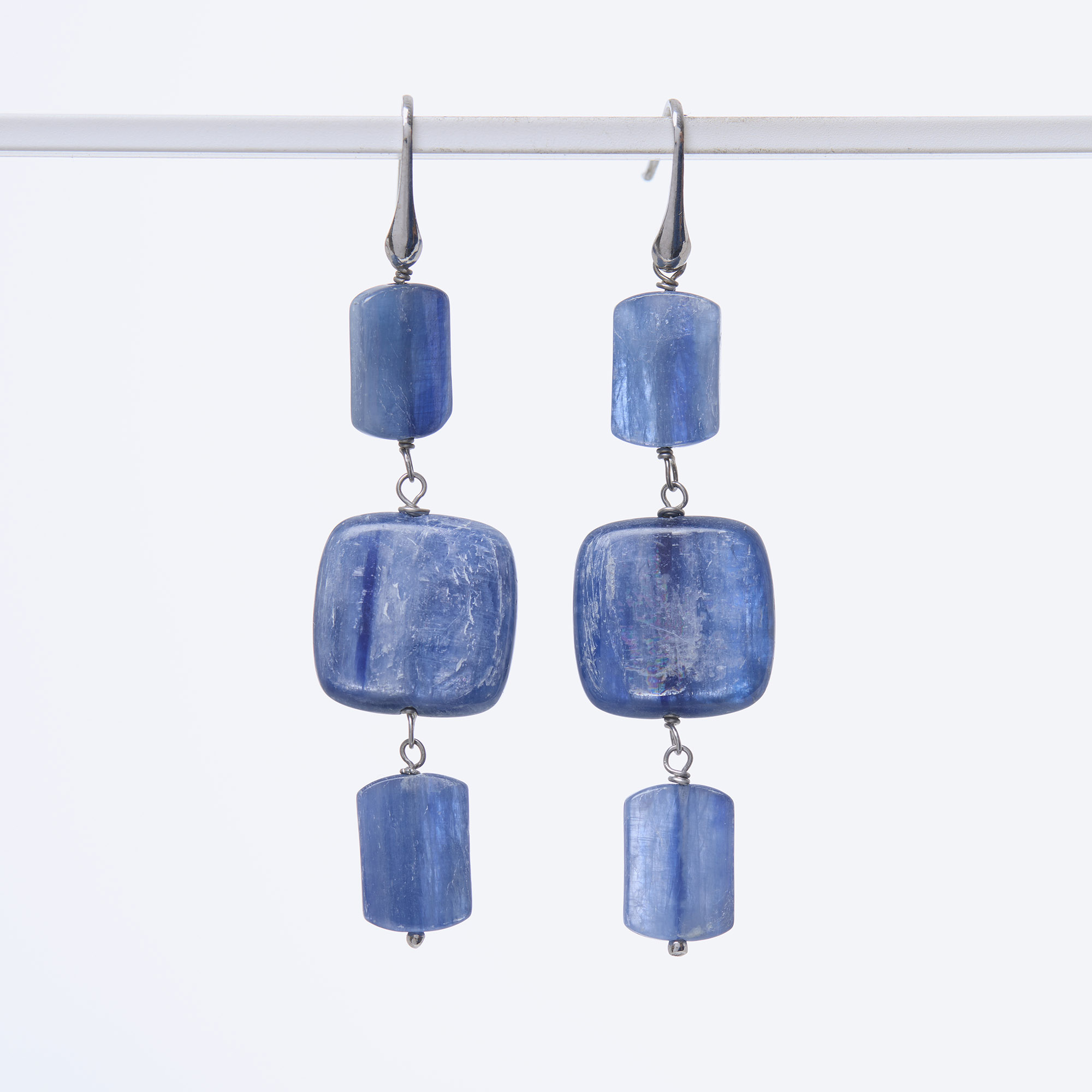Orecchini in Cianite a rettangolo e quadrato liscio, con amo in argento 925‰ rodiato. Realizzati in Italia.