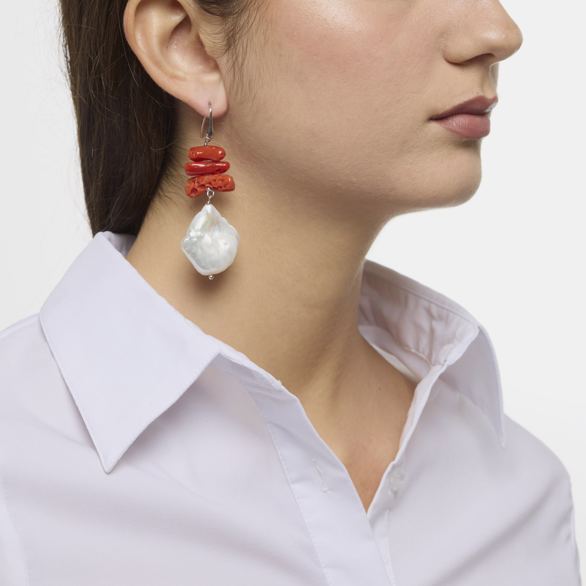 Orecchini in Corallo rosso e Perle d’acqua dolce, rilegato e con amo in Argento 925‰ rodiato. Realizzati in Italia.