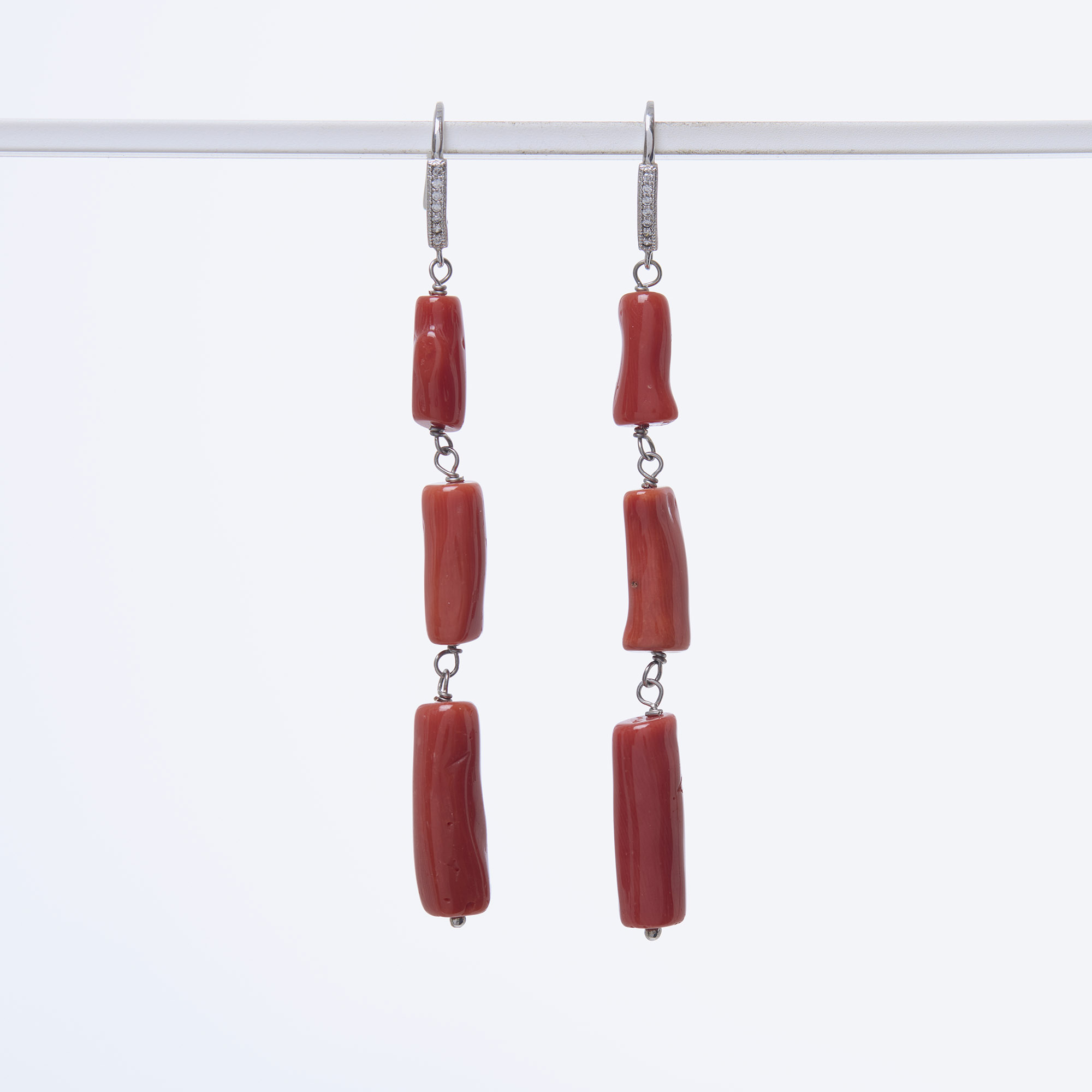 Orecchini in Corallo rosso a frangia, con amo in Argento 925‰ rodiato. Realizzati in Italia.