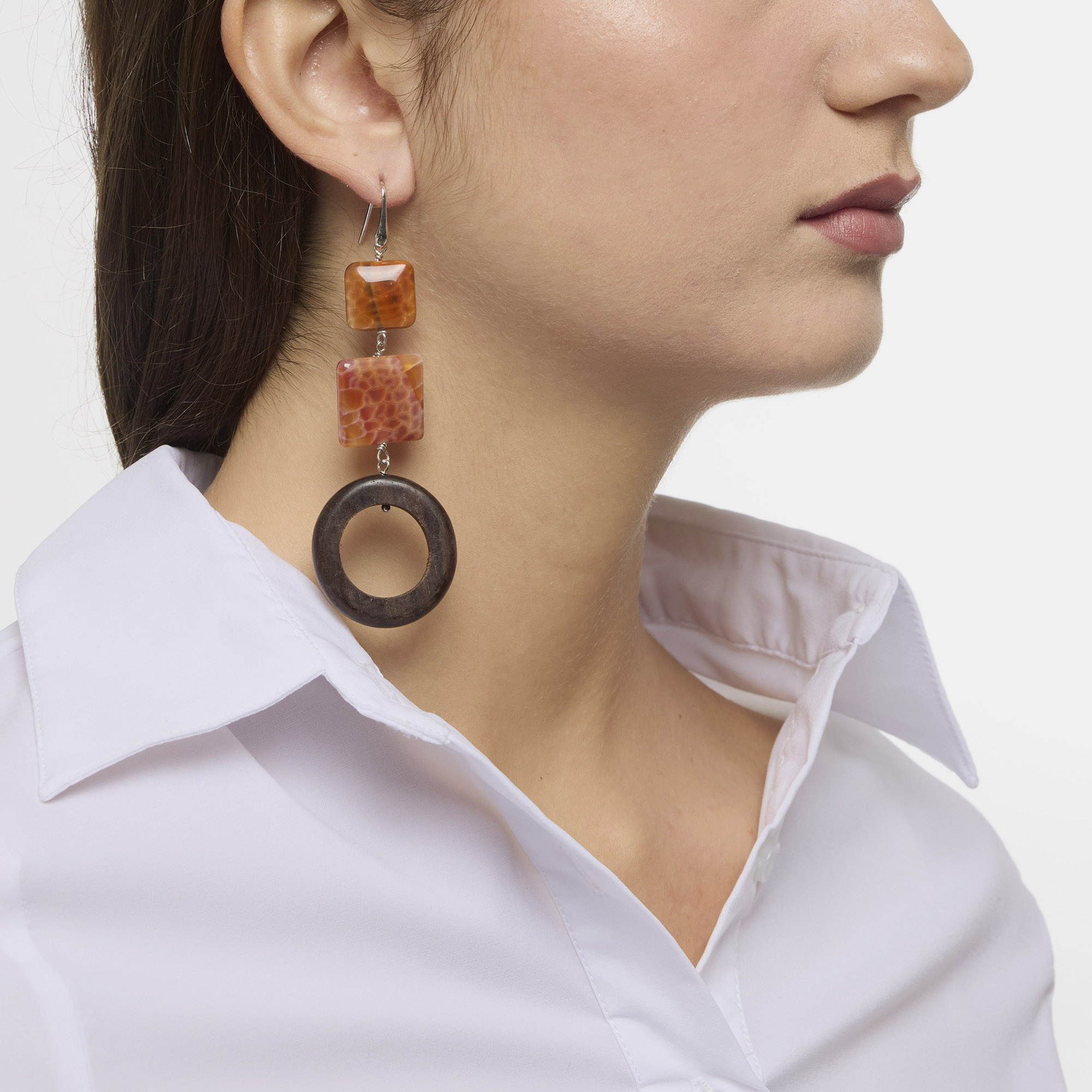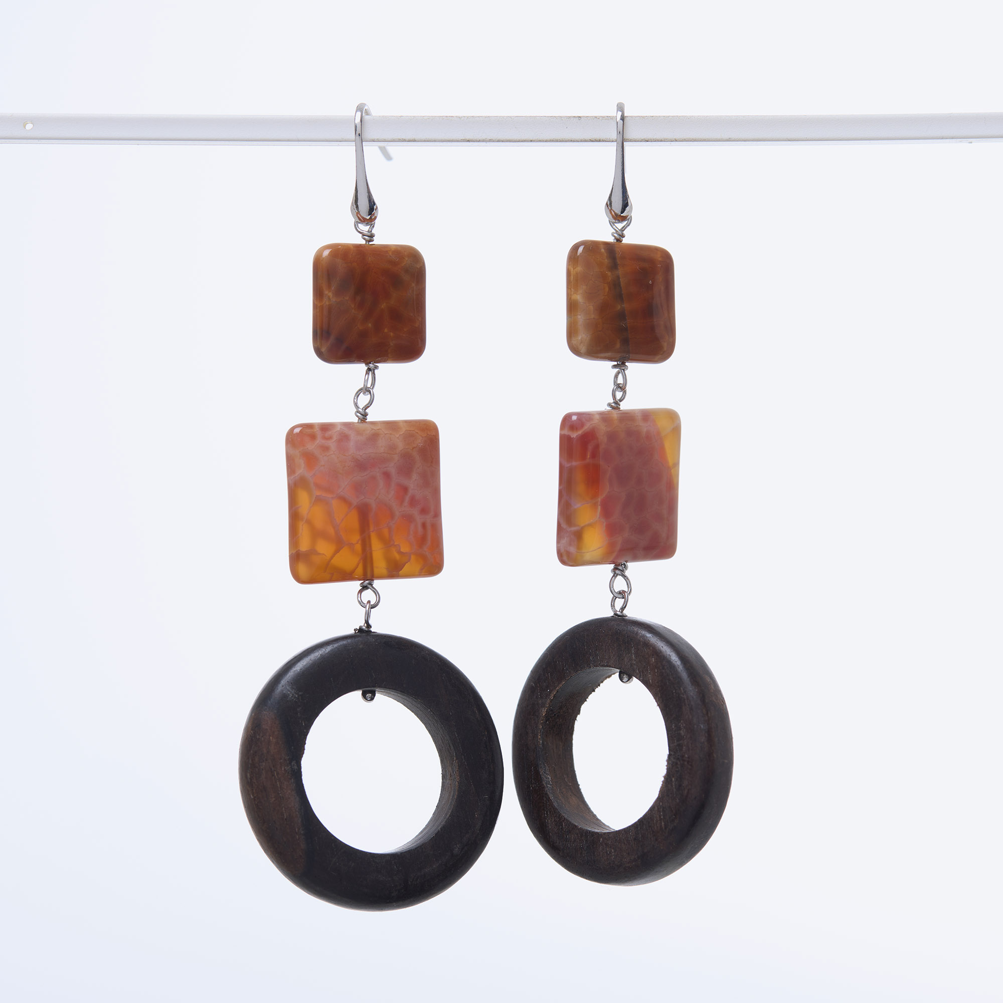 Orecchini realizzati con elementi in Ebano ed Agata di Fuoco, con amo in Argento 925‰ rodiato, realizzati in Italia.