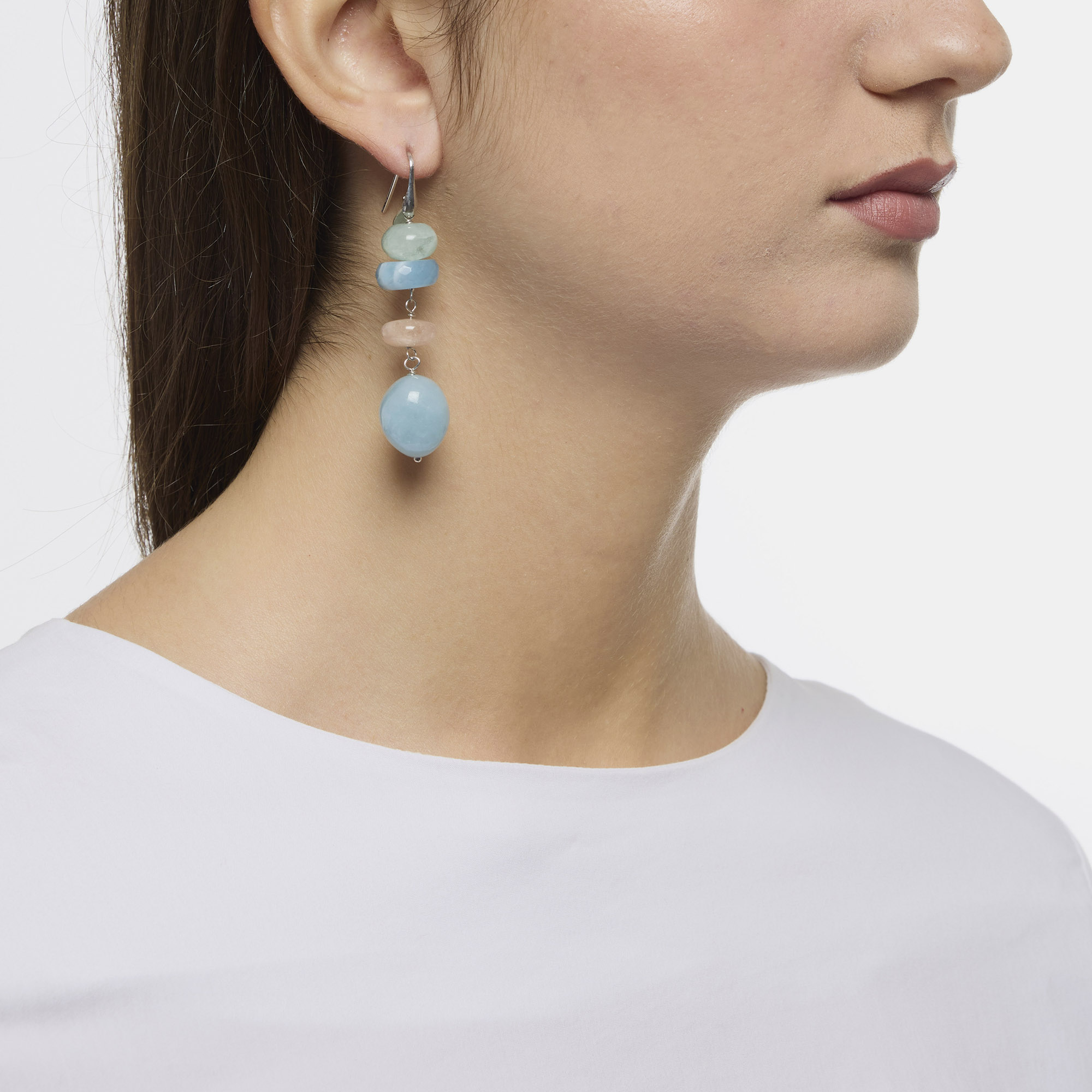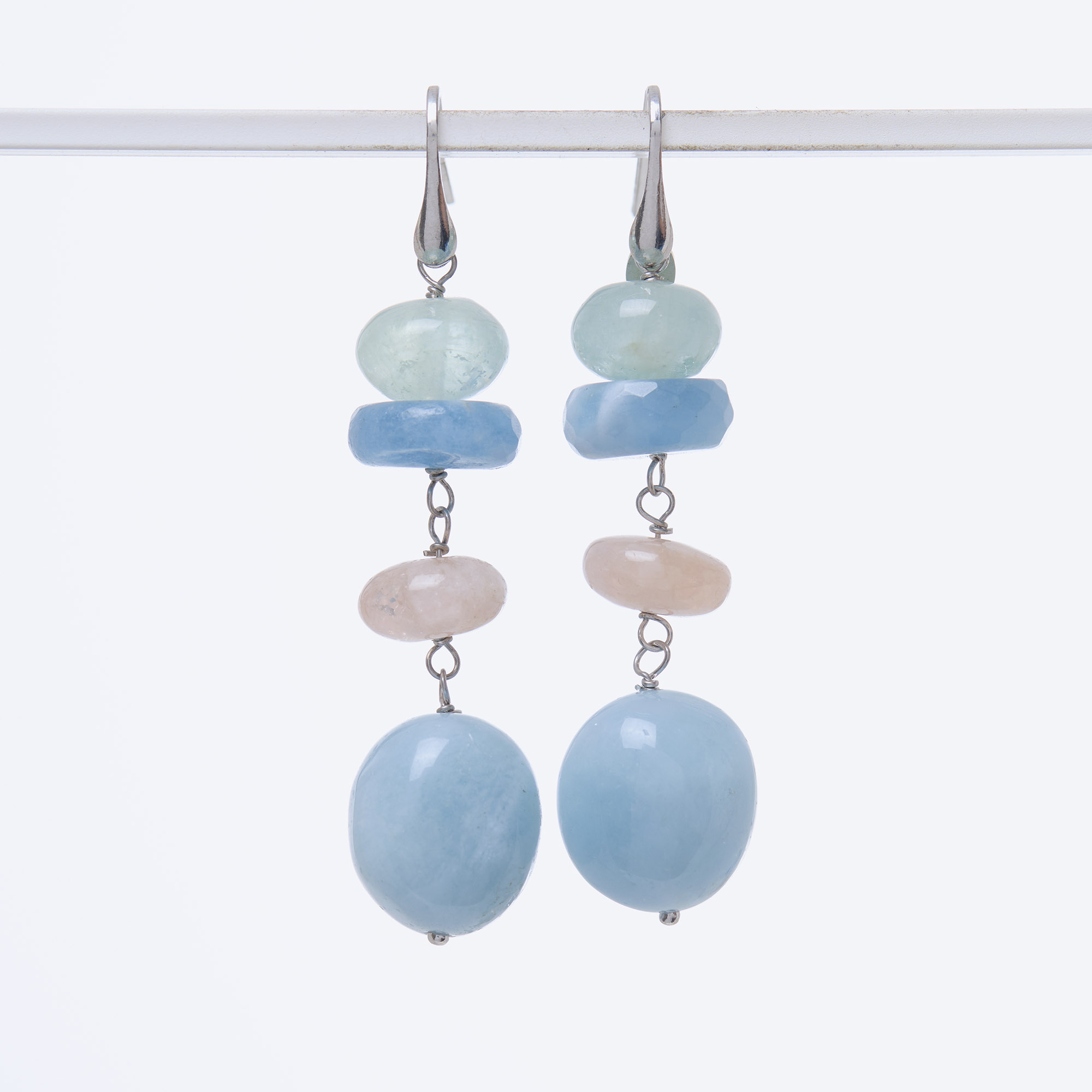 Orecchini in Morganite a rondella ed Acquamarina a sassetto liscio. Amo in argento 925‰ rodiato. Realizzati in Italia.