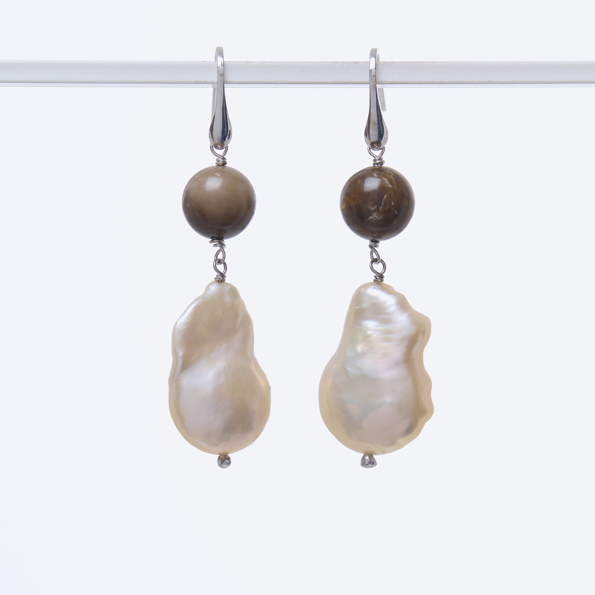 Orecchini in Perle Champagne piatte e Diaspro Landscape, con amo in Argento 925‰ rodiato. Realizzati in Italia.