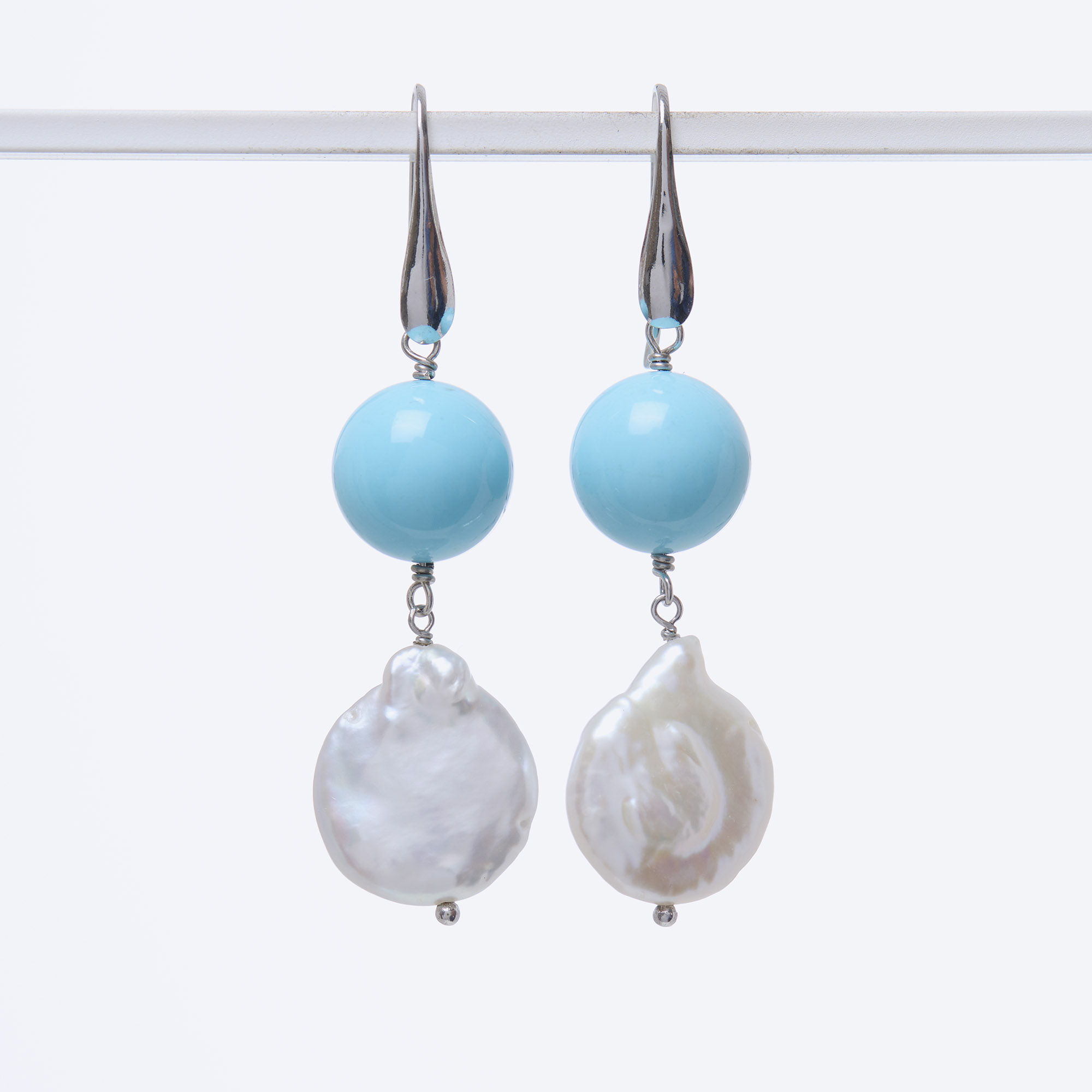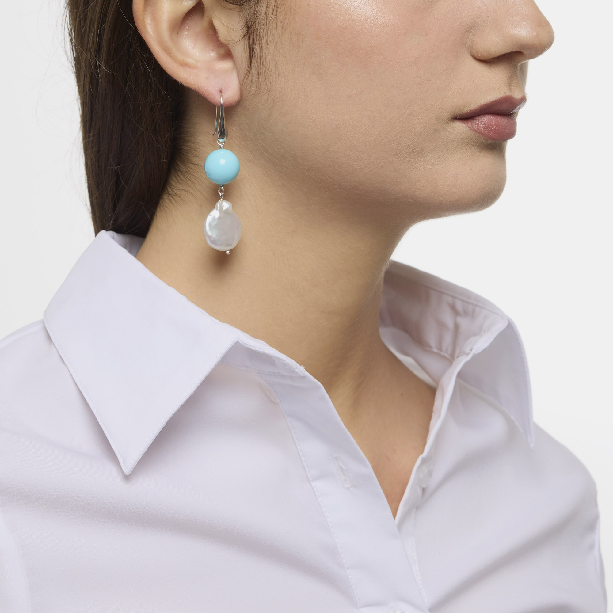 Orecchini in Perle d’acqua dolce e Pasta di Turchese, con amo in Argento 925‰ rodiato, realizzati in Italia.