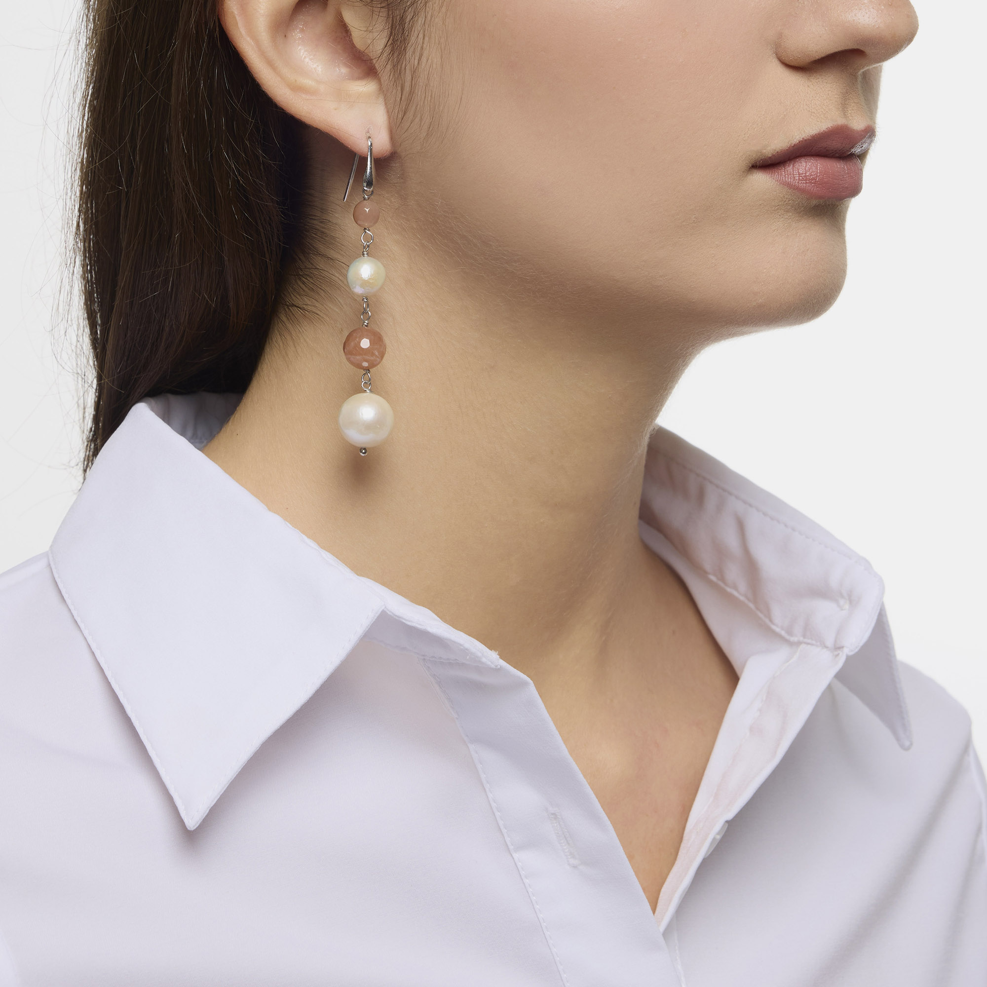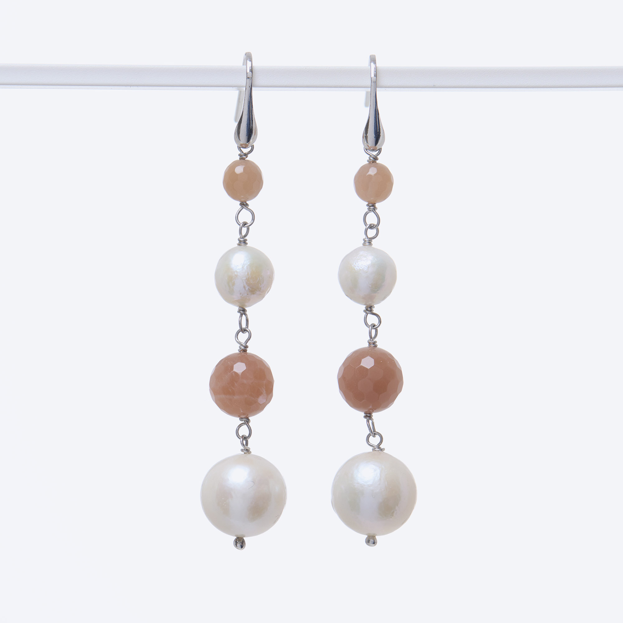 Orecchini in Perle d’acqua dolce e Pietra di Luna a sfera liscia e sfaccettata, con amo in argento 925‰ rodiato. Realizzati in Italia.