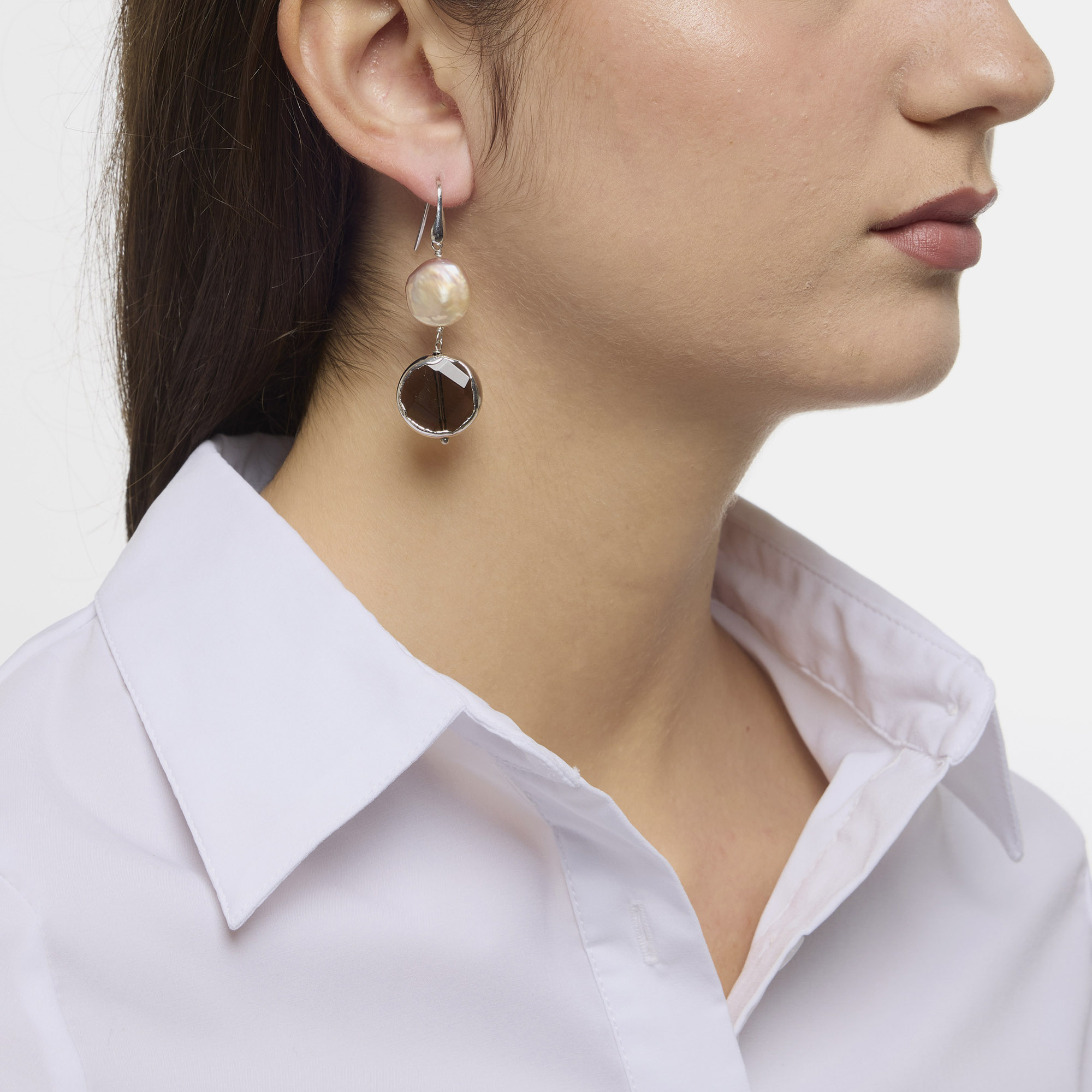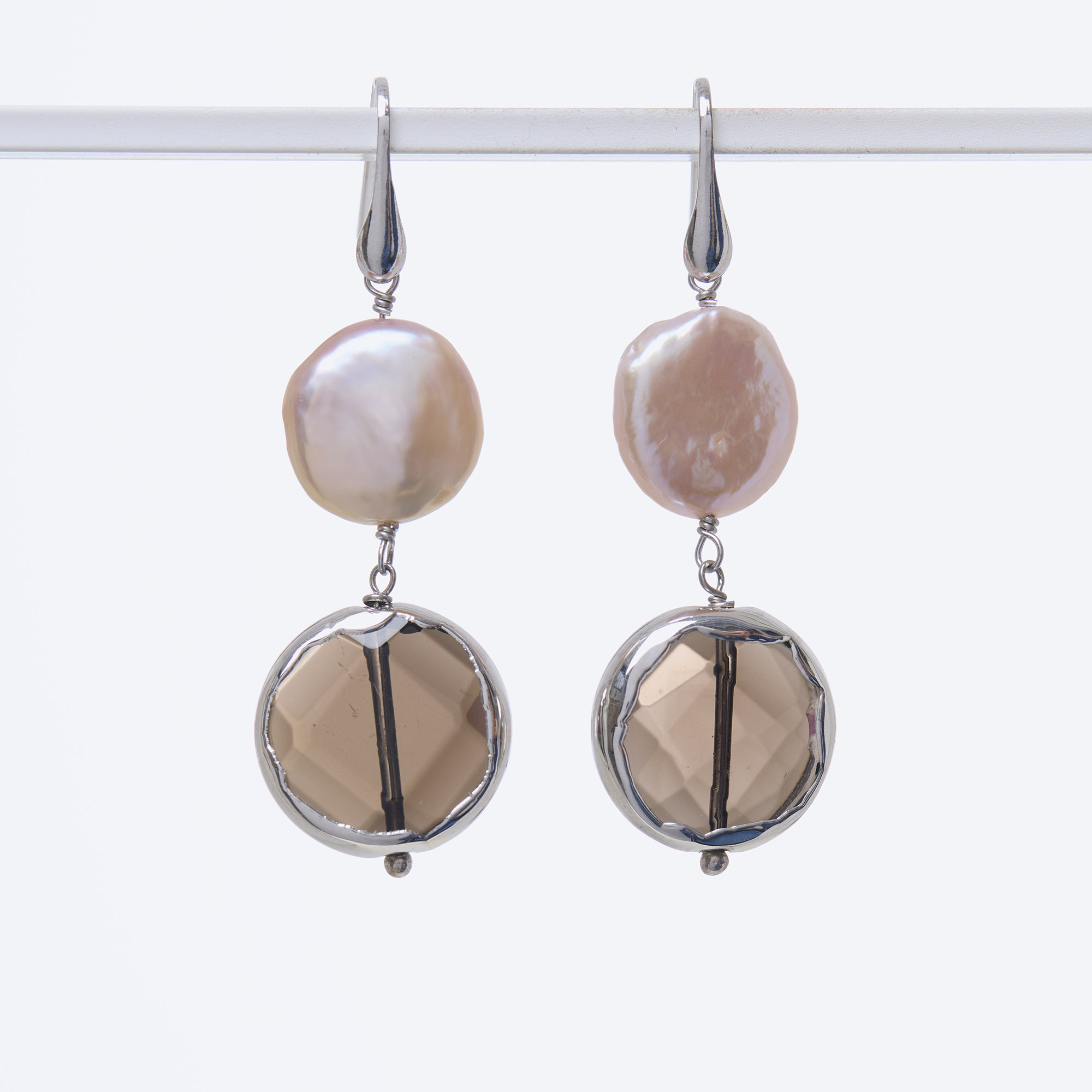 Orecchini in Perle d’acqua dolce piatte e Quarzo Fumé scontornato in lega esclusiva rodiata, con amo in Argento 925‰ rodiato. Realizzati in Italia.