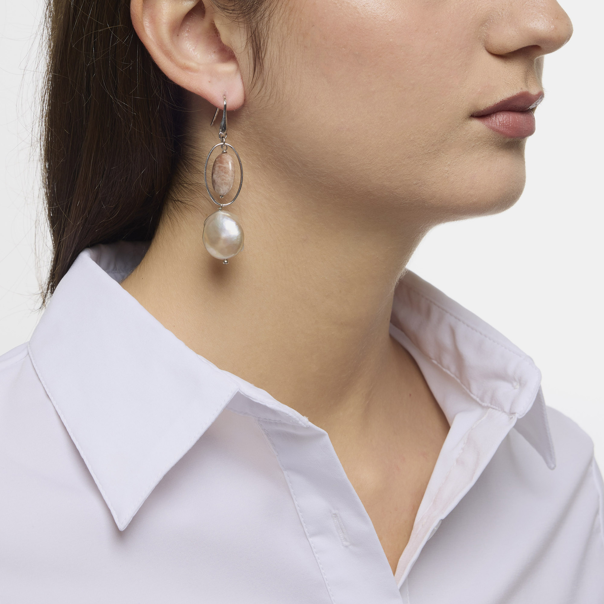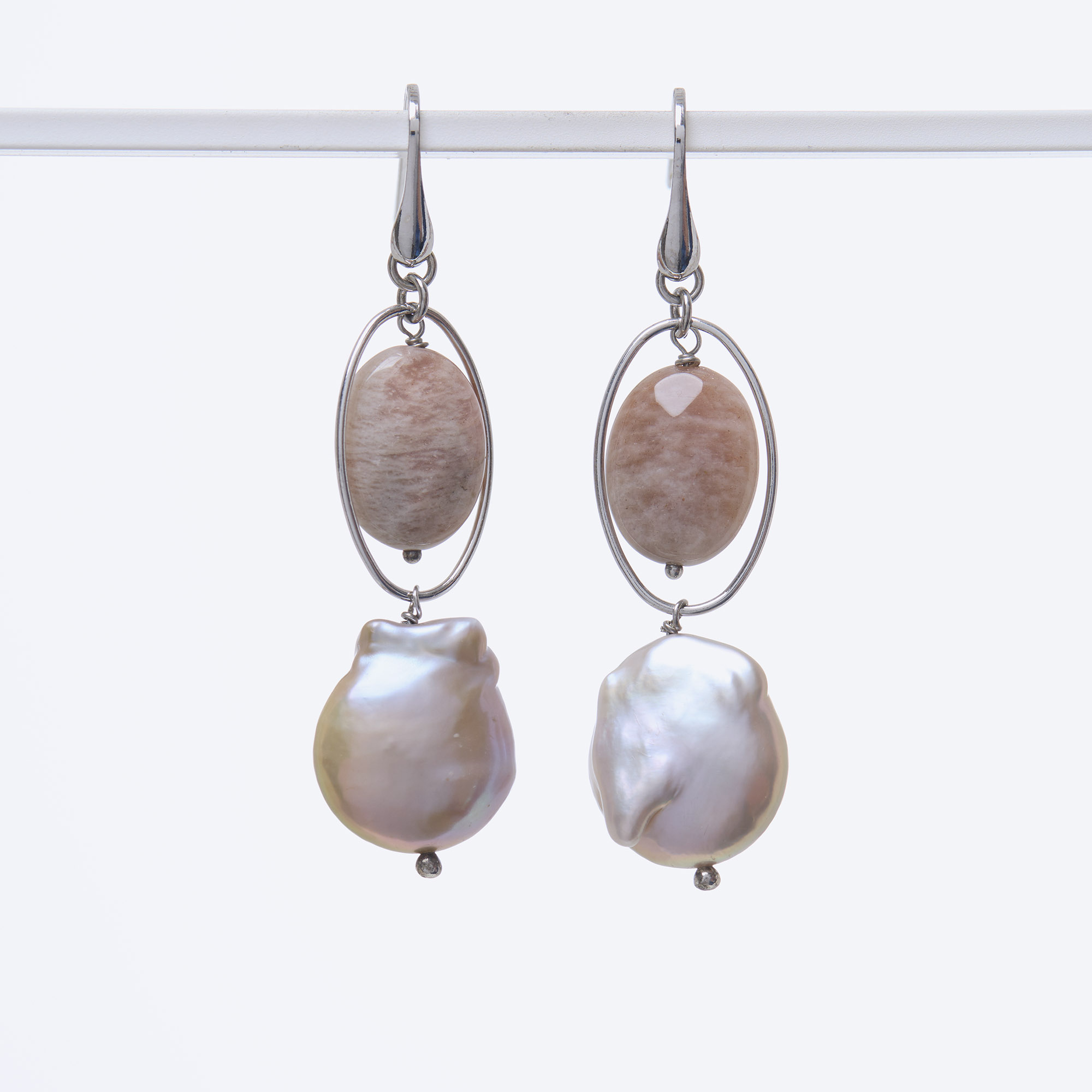 Orecchini in Perle d’acqua dolce Grigie piatte e Pietra di Luna rosa, con elemento ovale ed amo in argento 925‰ rodiato. Realizzati in Italia.