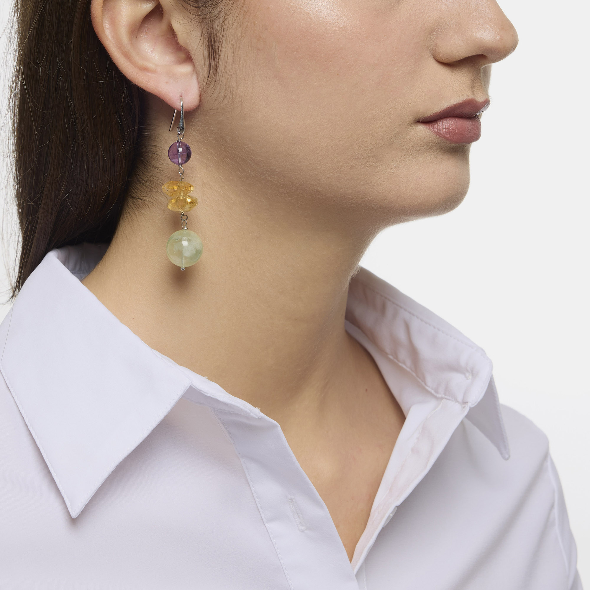 Orecchini in Prehnite, Citrino ed Ametista, in sfere lisce e forme sfaccettate. Amo in argento 925‰ rodiato. Realizzati in Italia.