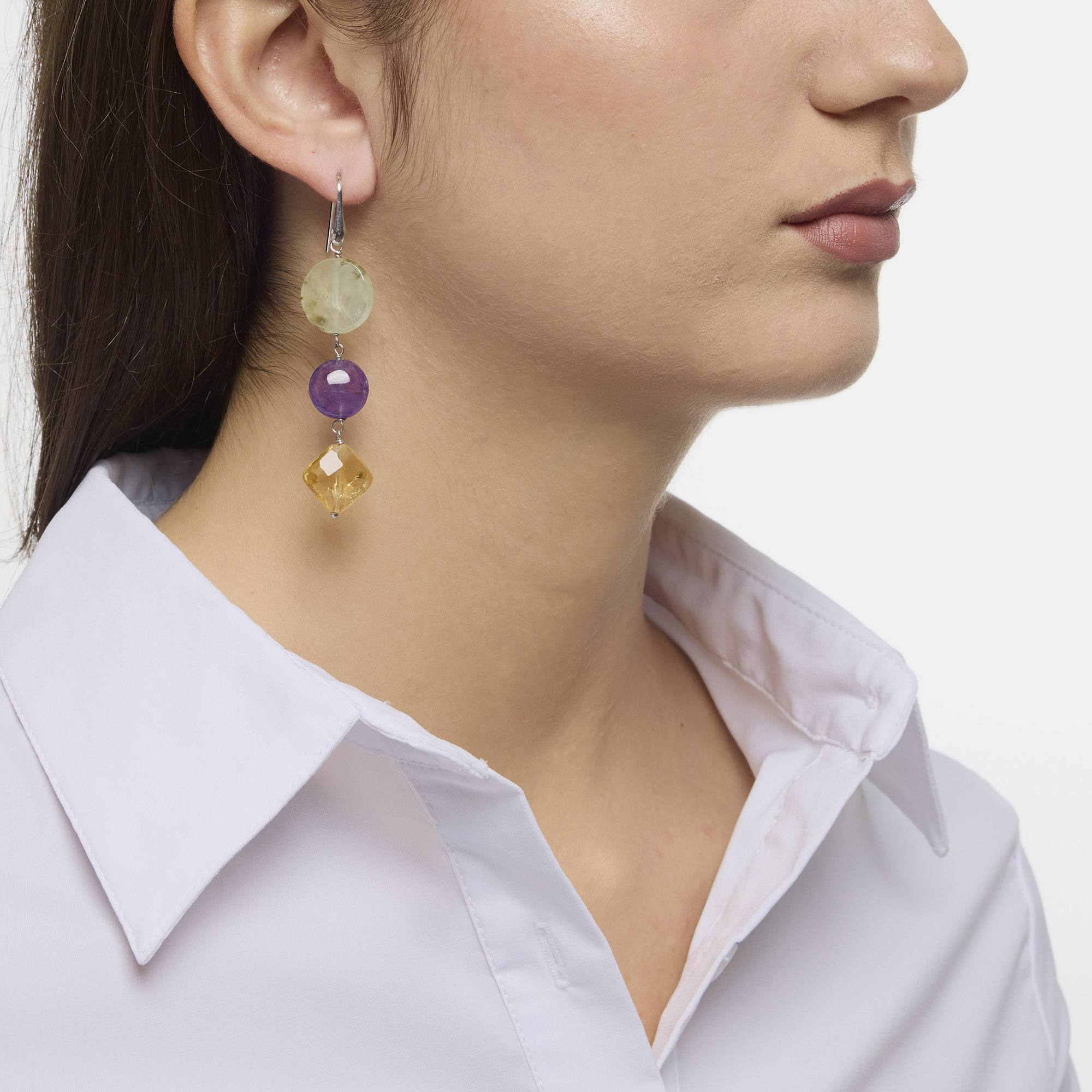 Orecchini in Prehnite, Citrino ed Ametista, in forme piatte lisce e sfaccettate. Amo in argento 925‰ rodiato. Realizzati in Italia.