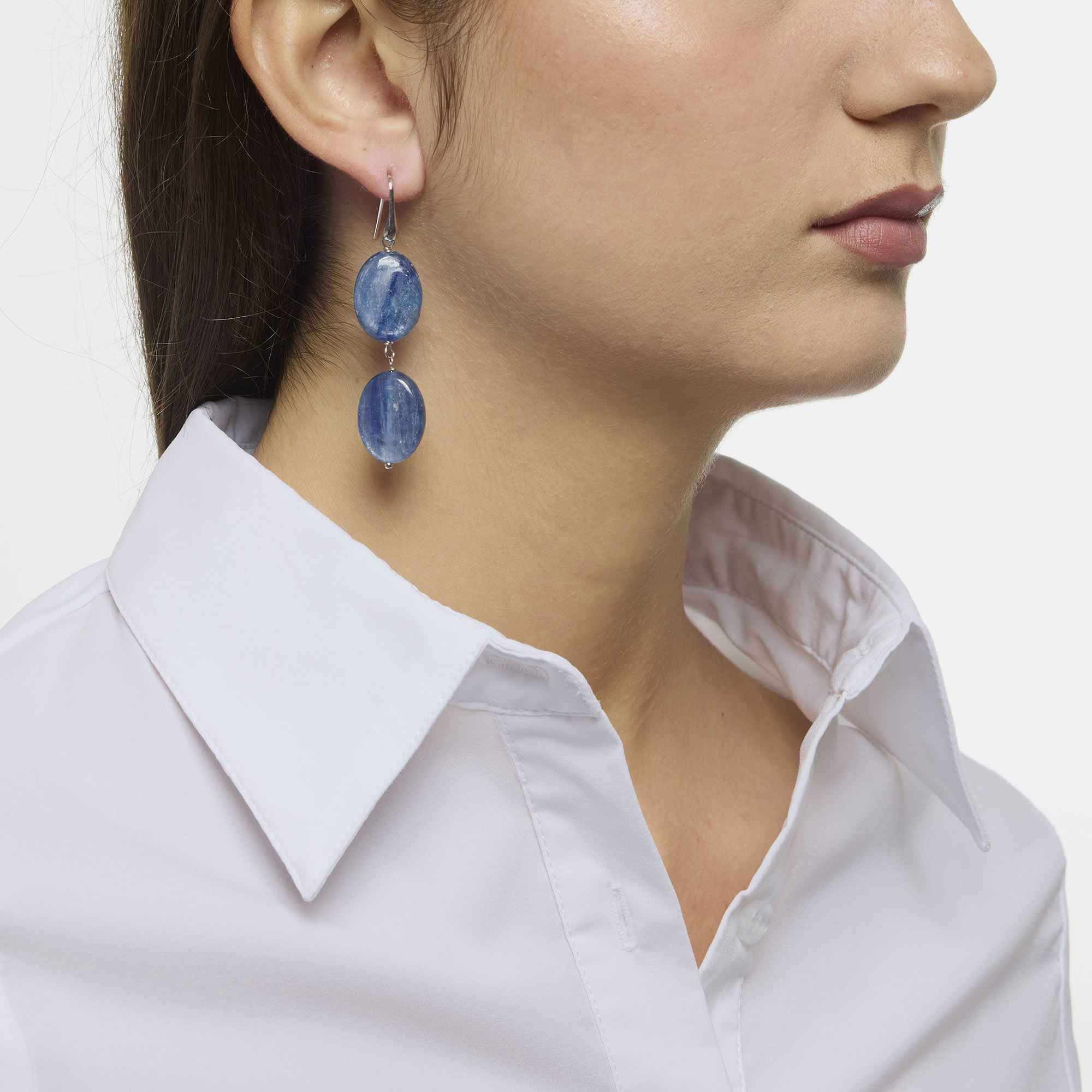 Orecchini a due pietre in Cianite rilegata con amo in argento 925‰ rodiato. Realizzati in Italia.