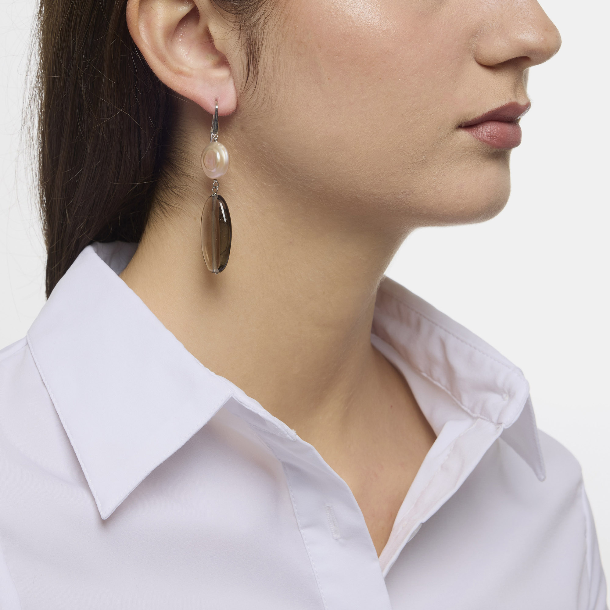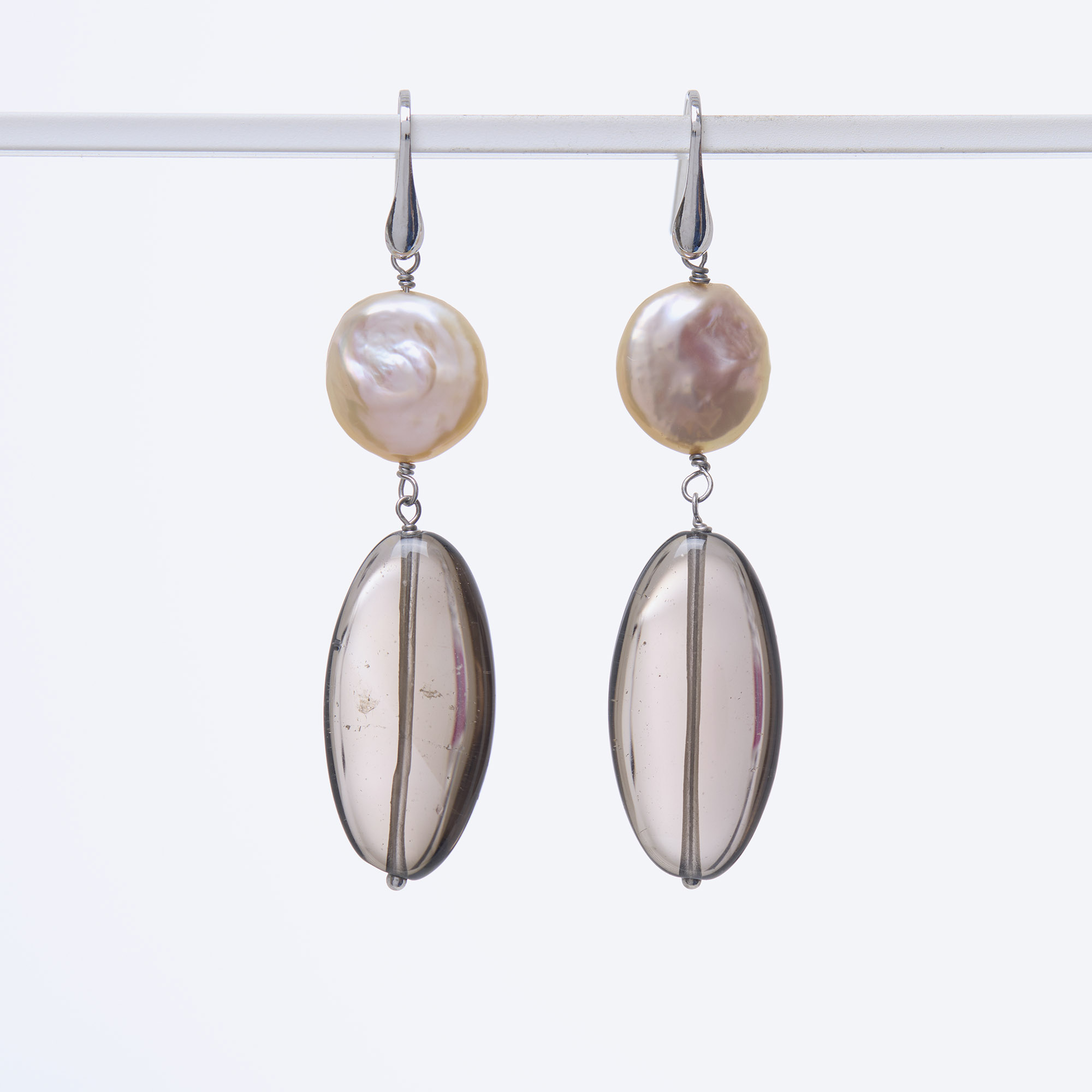Orecchini in Quarzo Fumé ovale liscio e Perle d’acqua dolce Coin, con amo in Argento 925‰ rodiato. Realizzati in Italia.