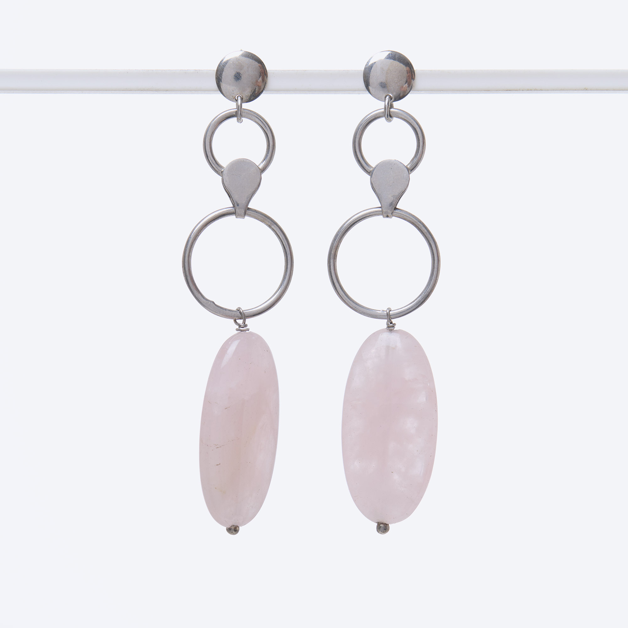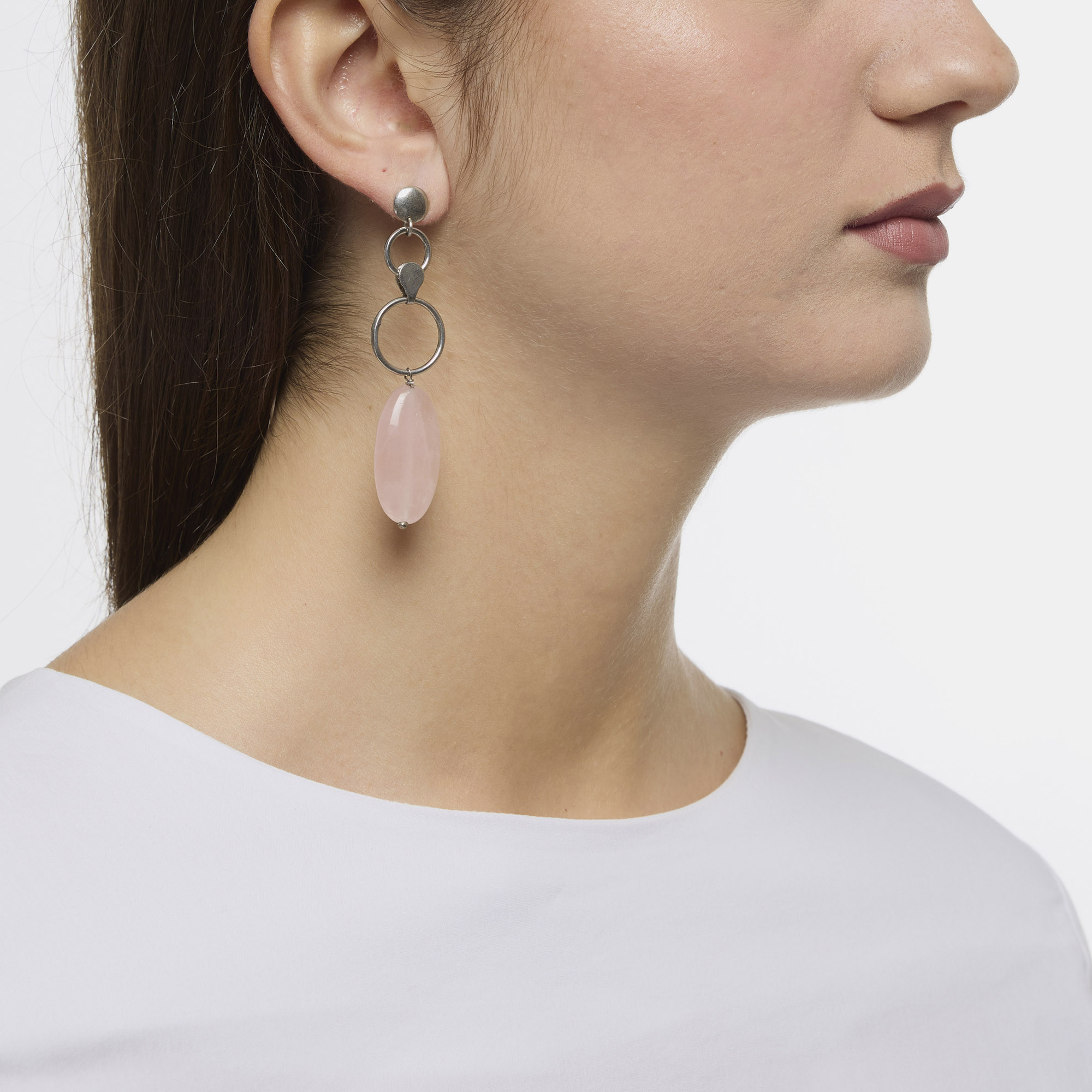 Orecchini in Quarzo Rosa di forma ovale, con elementi e perno in argento 925‰ rodiato. Realizzati in Italia.